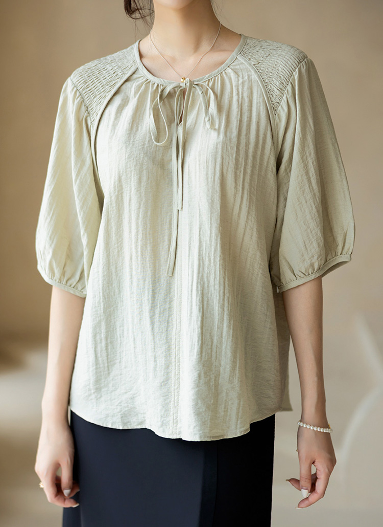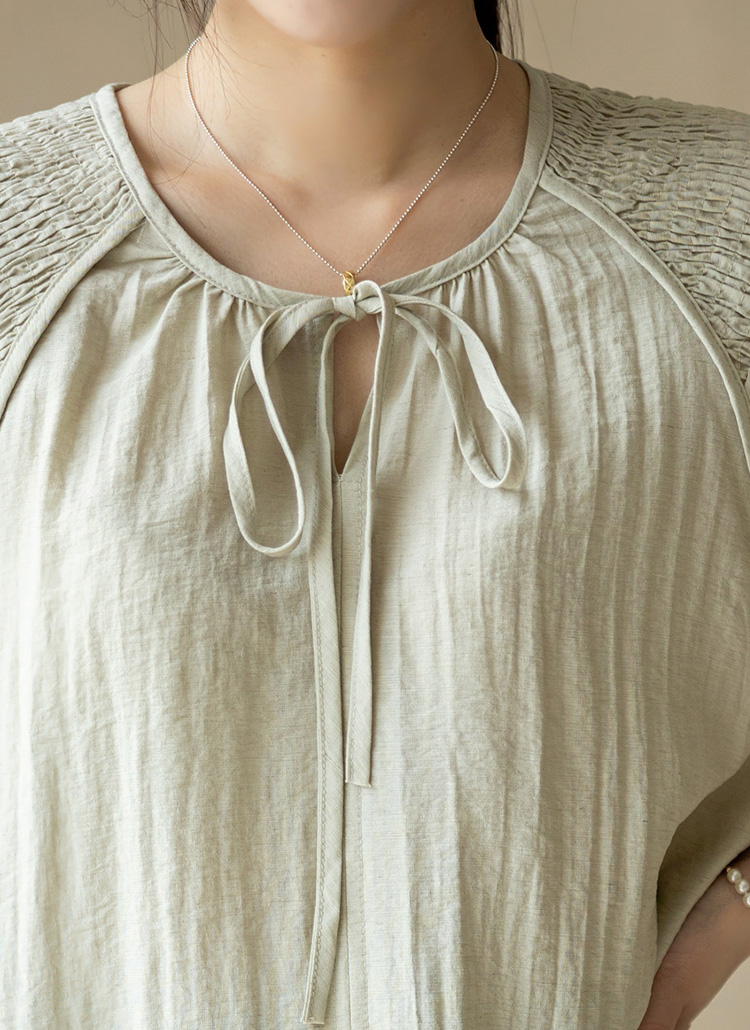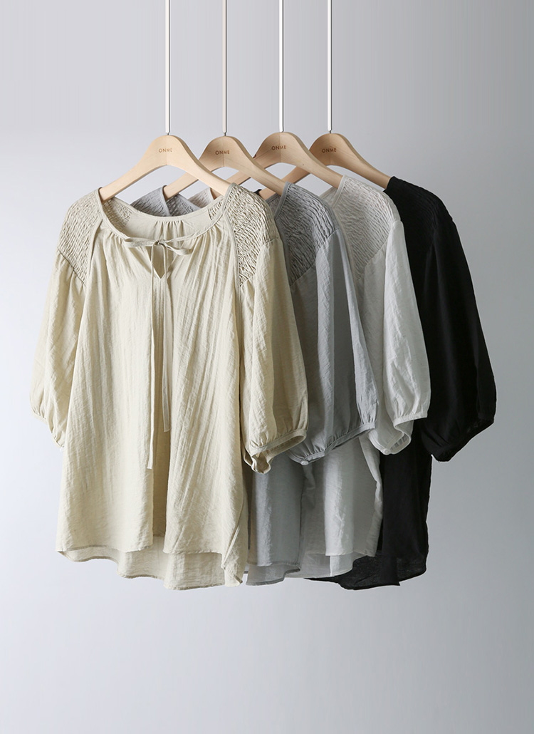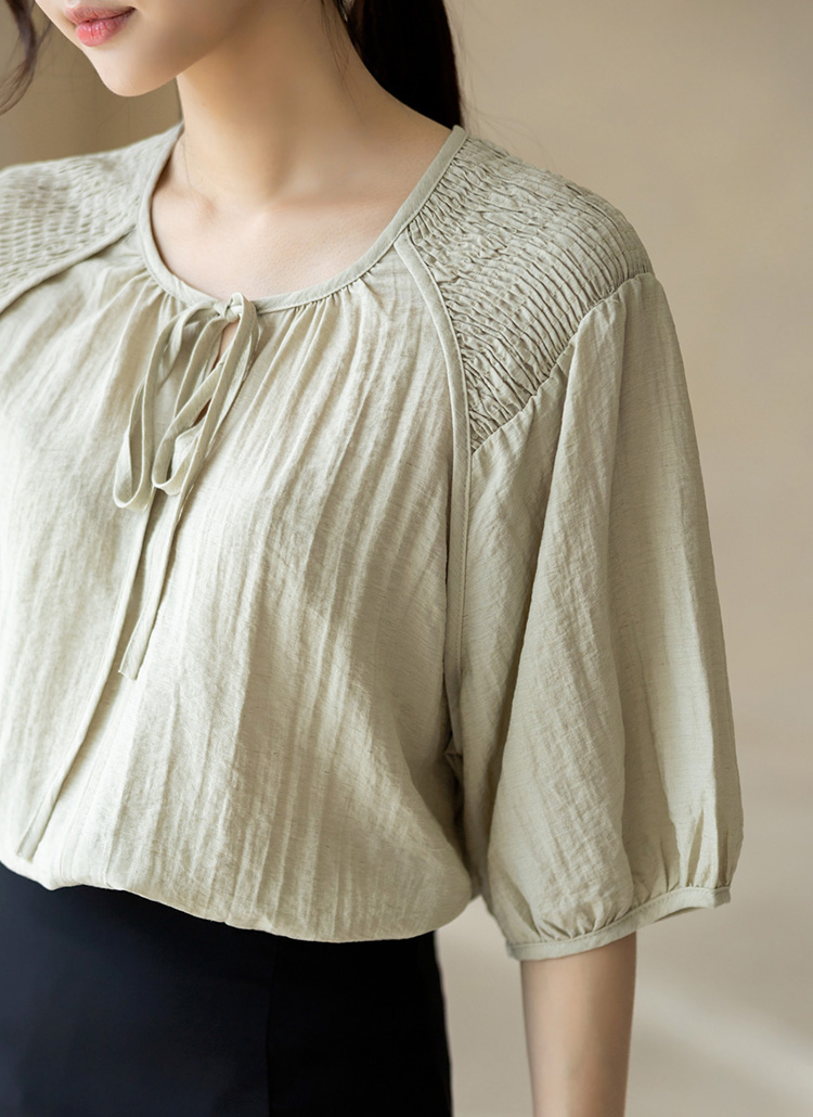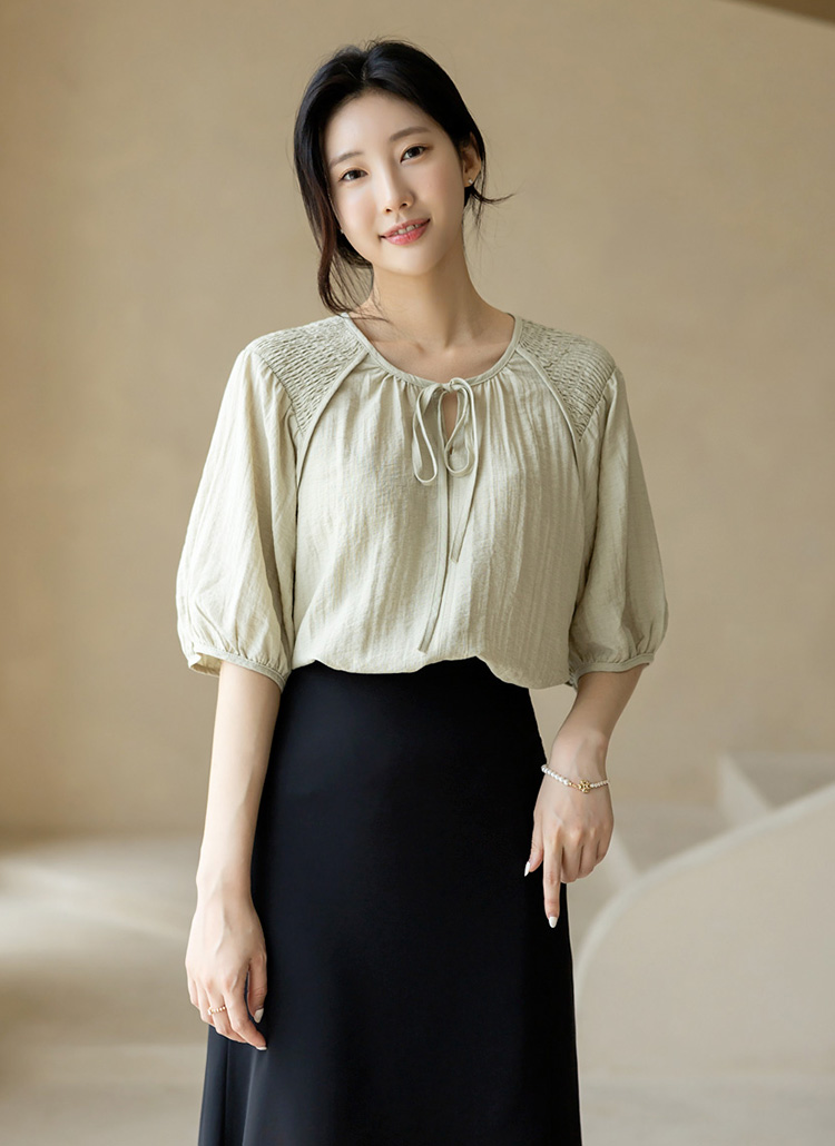 (4 Colors) Smocked Shoulder Tie-Neck Relaxed Top
