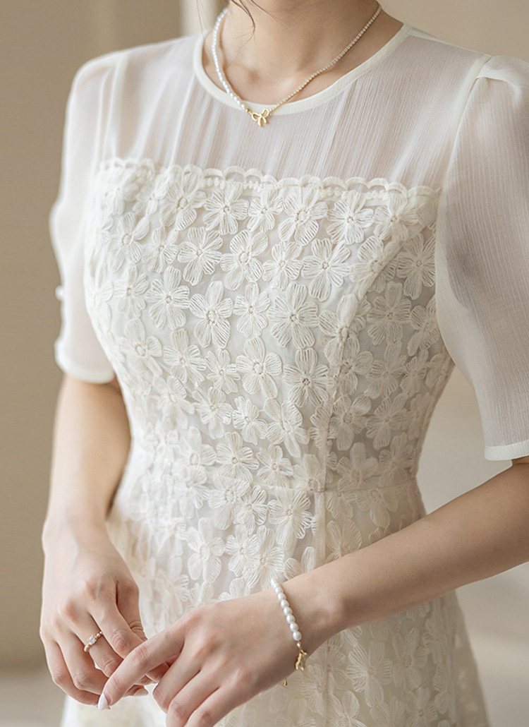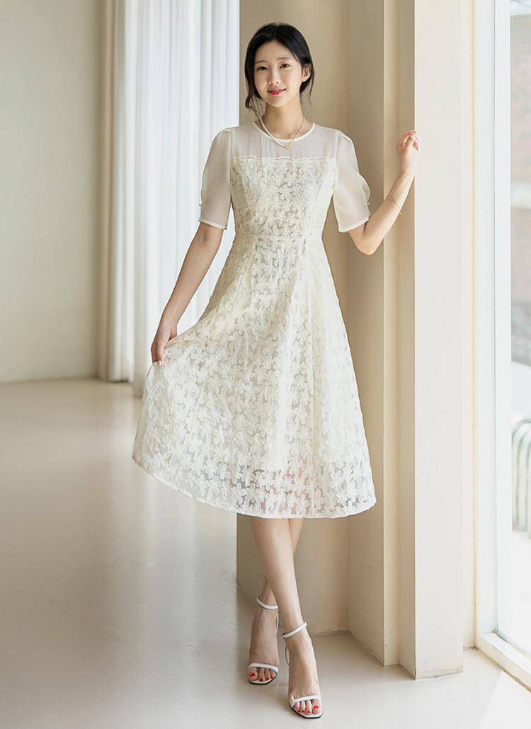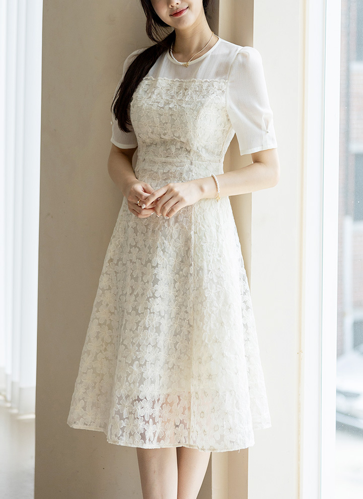 [LouisAngel] Sheer Yoke Flower Embroidery Lace Flare Dress