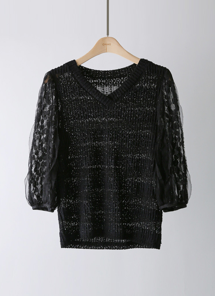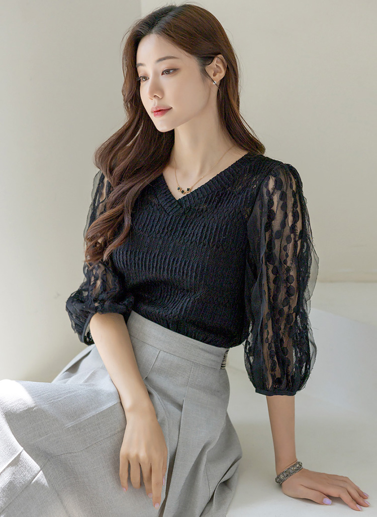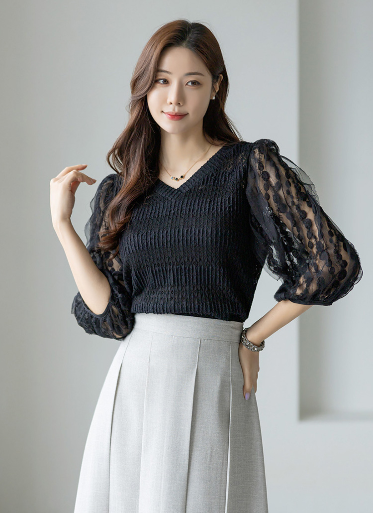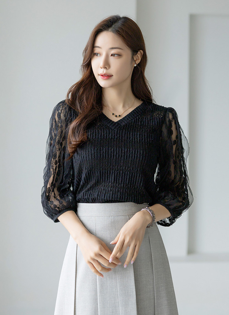 [LouisAngel] Dot Lace Sleeve V-Neck Jacquard Knit Top