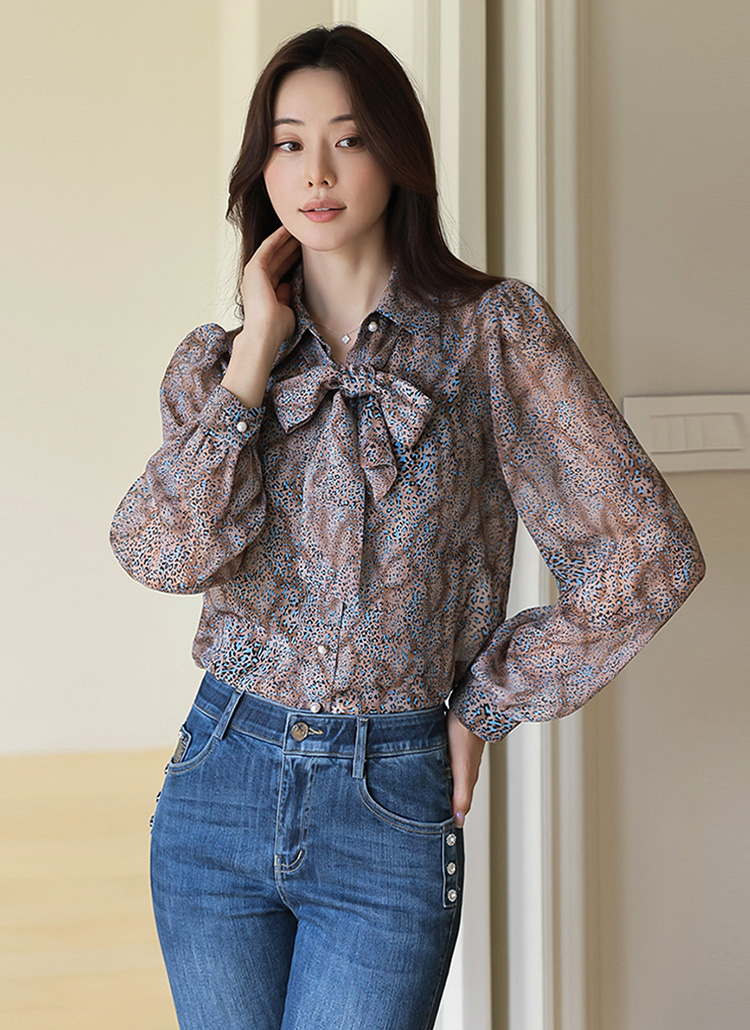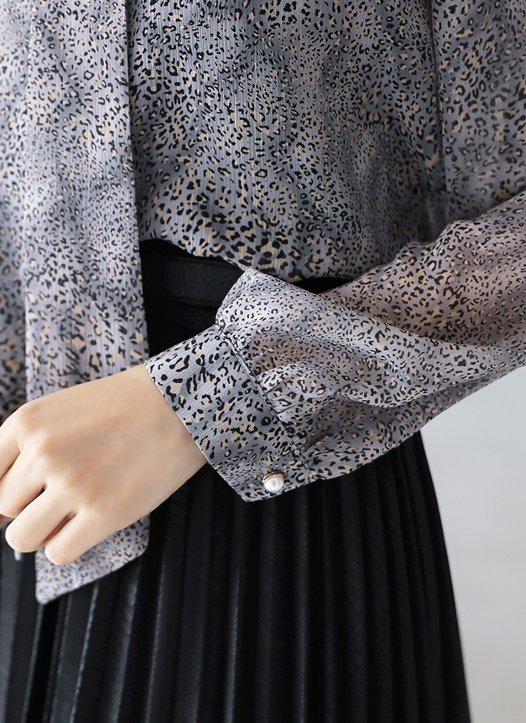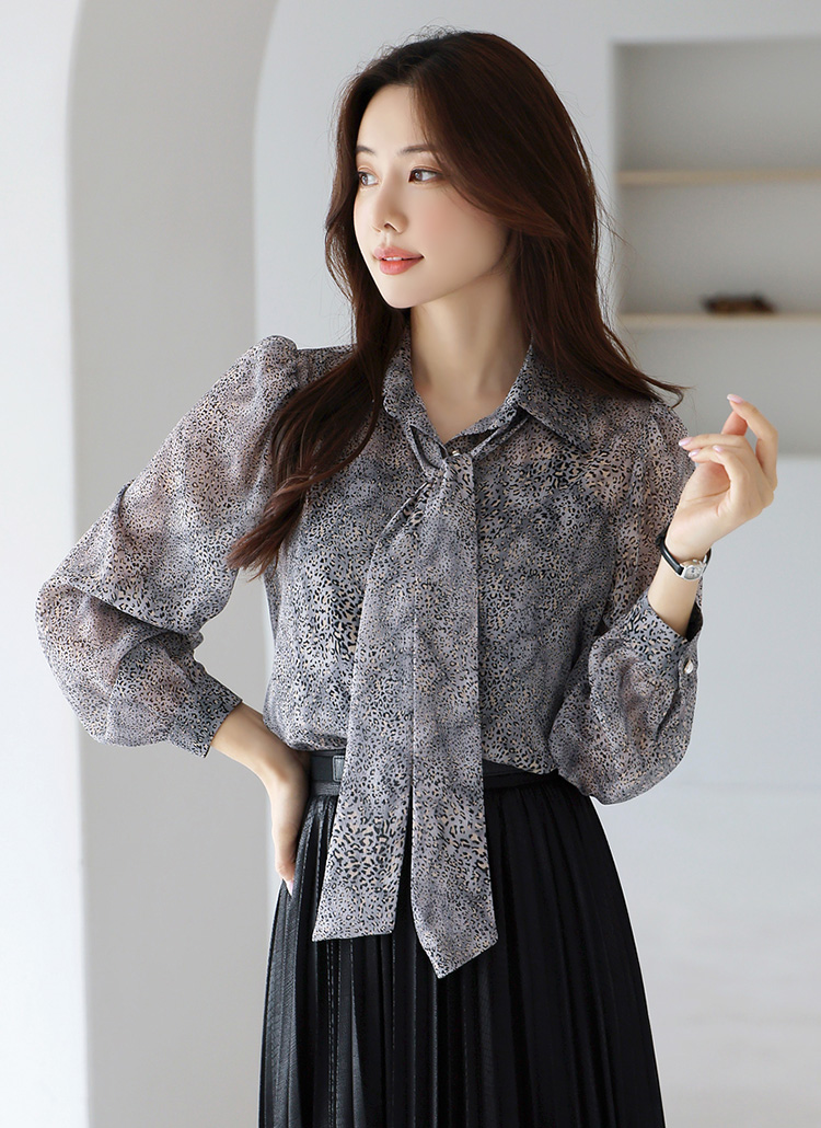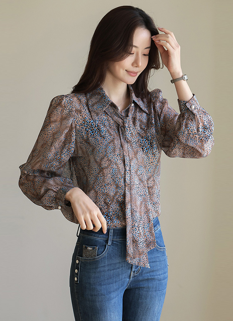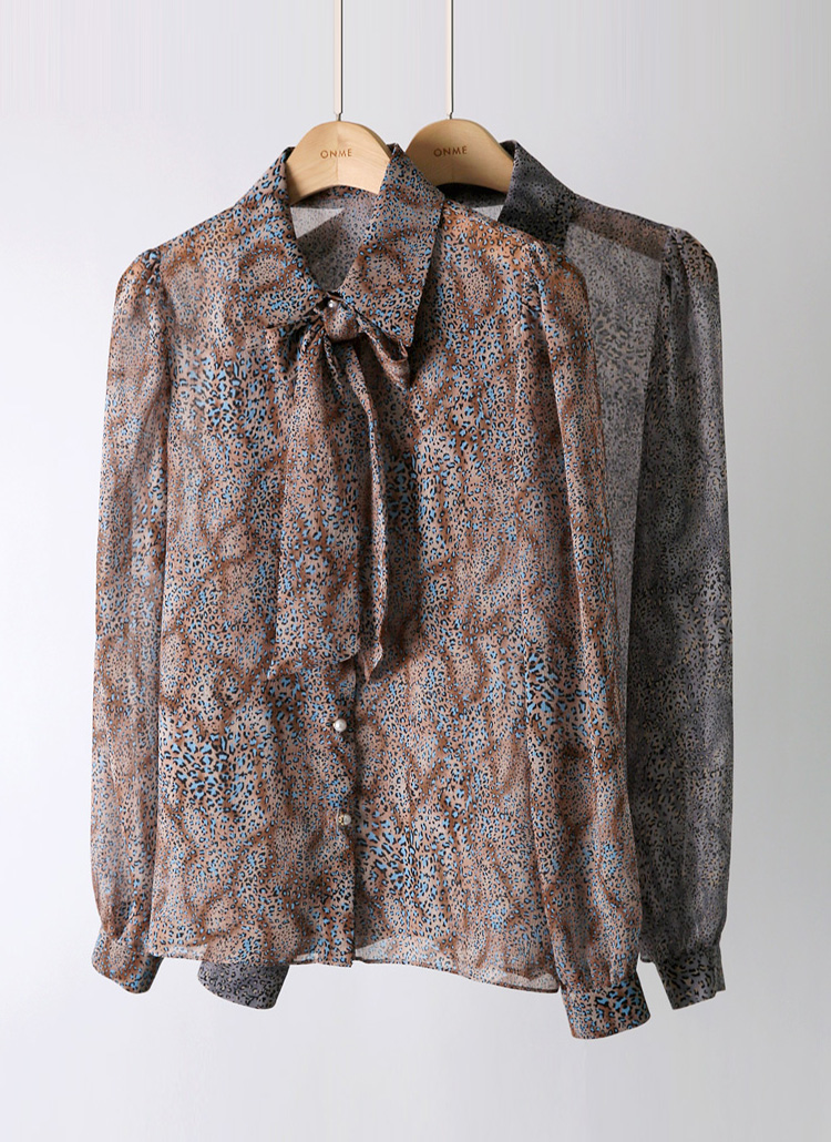 [LouisAngel] Leopard Print Tie-neck Chiffon Blouse