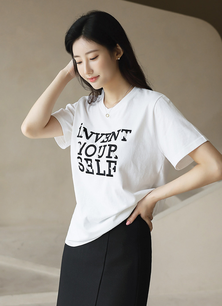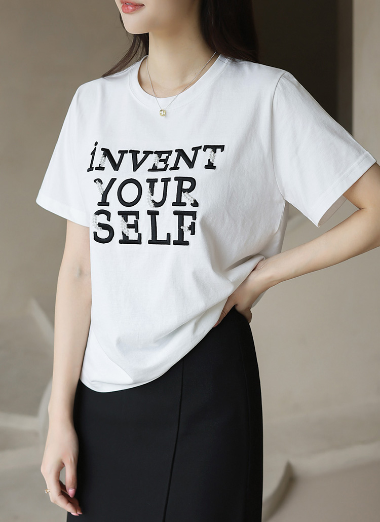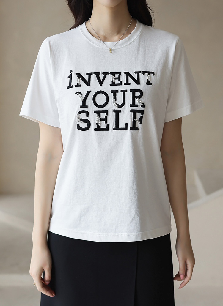 [The Onme] Pearl Embellished Lettering Cotton T-Shirt