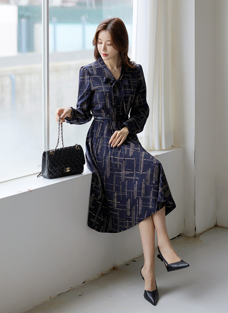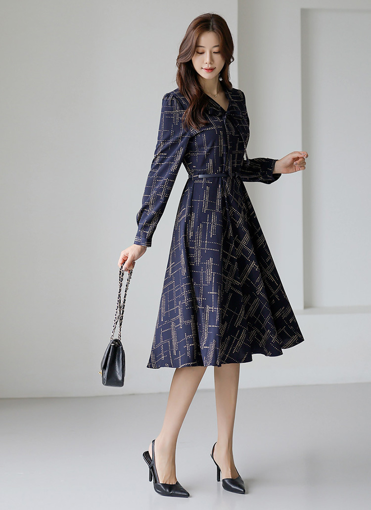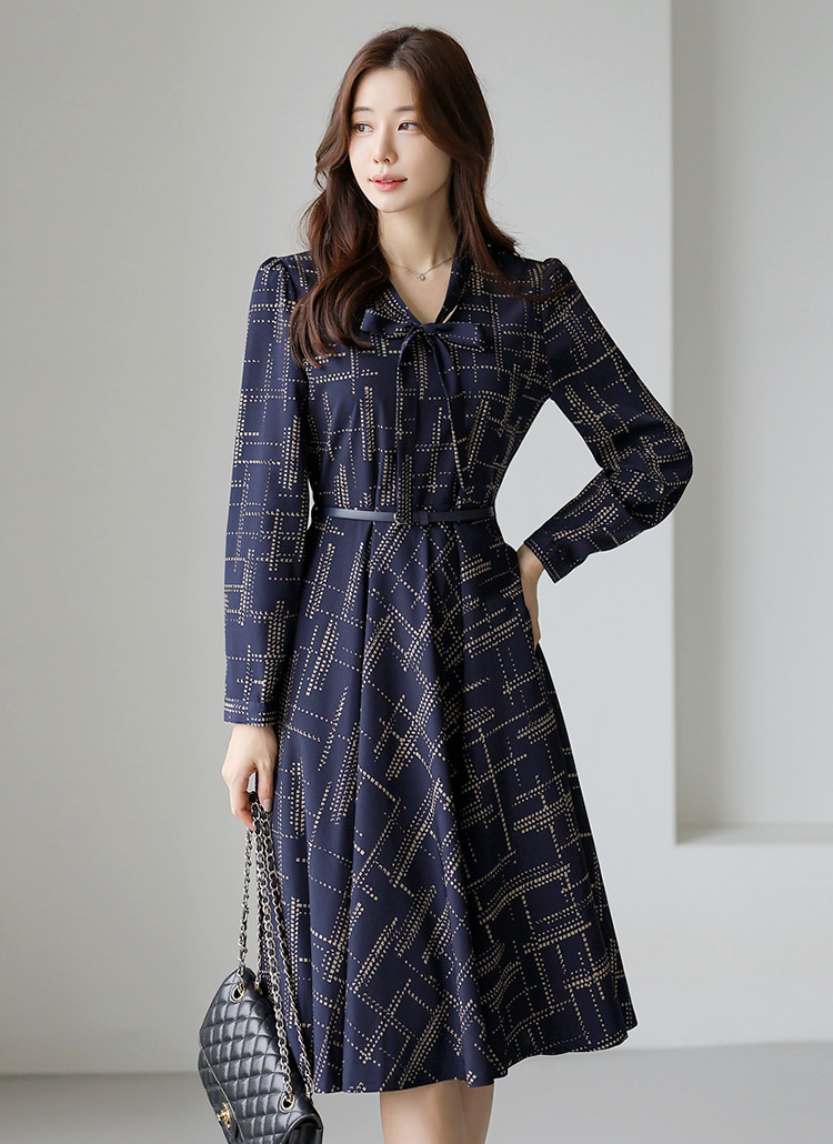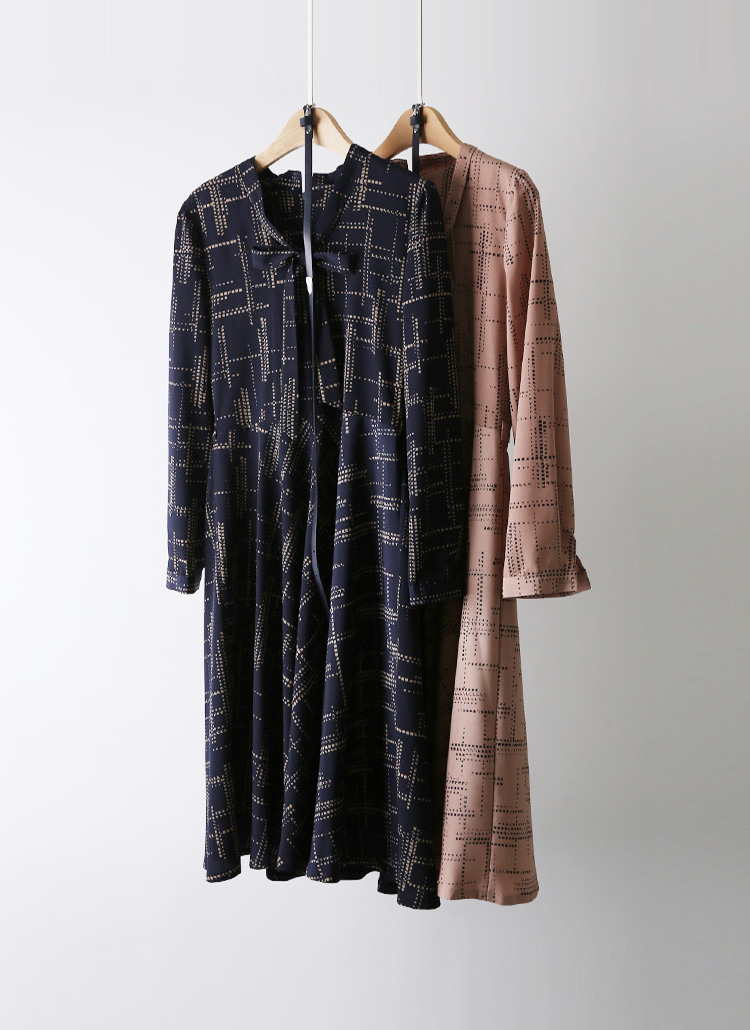 엔밀라 도트 스케치 패턴 리본 넥 벨트SET A라인 플레어 원피스에요 :)