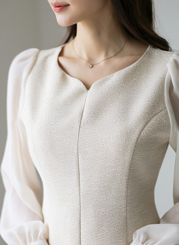 하트넥 디자인과 쉬폰 슬리브로 페미닌 무드의 절정을 선사하는