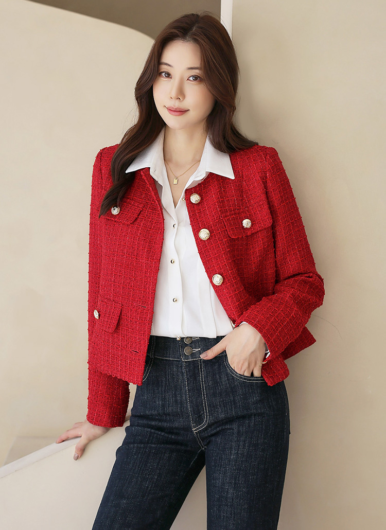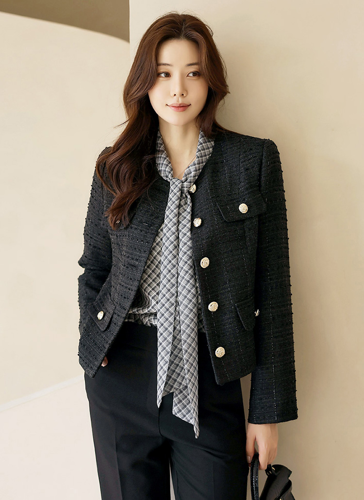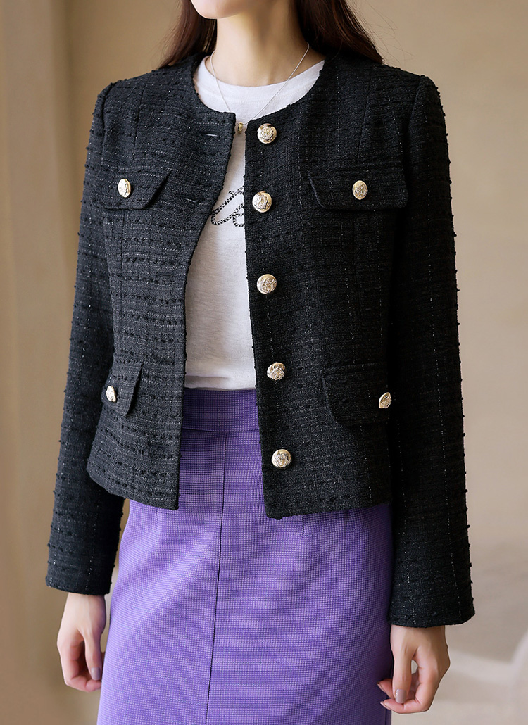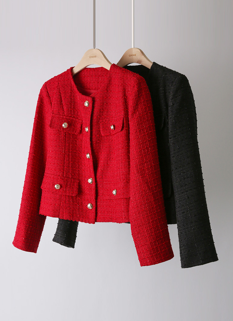[LouisAngel] Collarless Bold Button Metallic Tweed Jacket