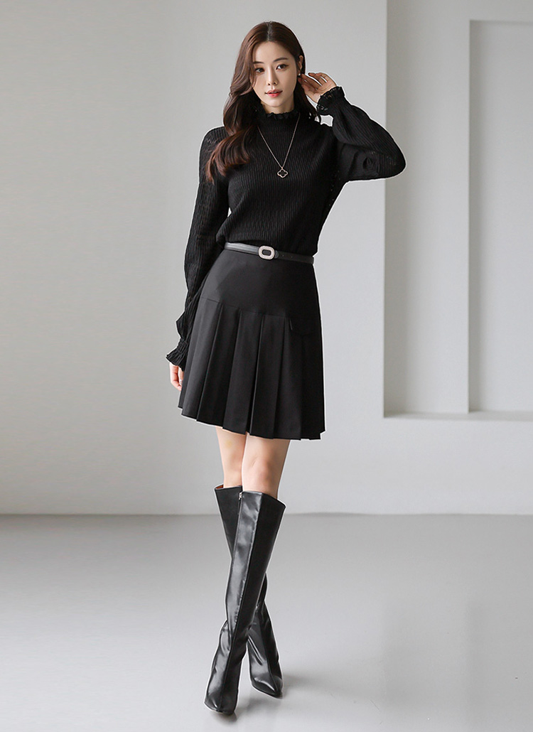 밑단의 플리츠 디테일이 돋보이며 A라인으로 퍼지는 디자인이