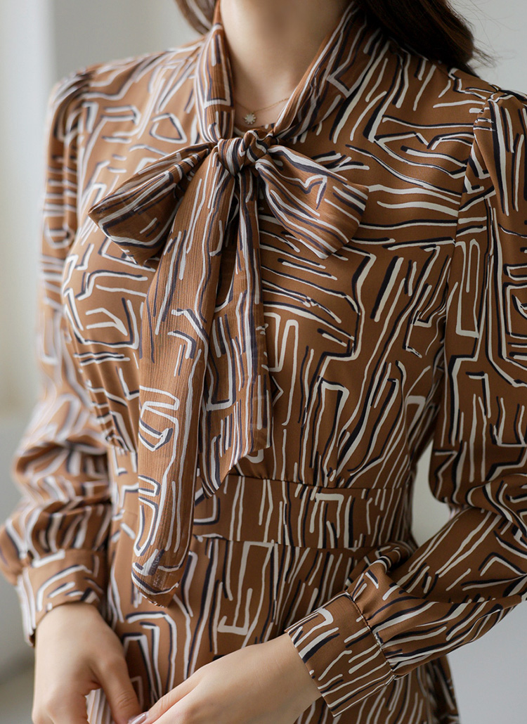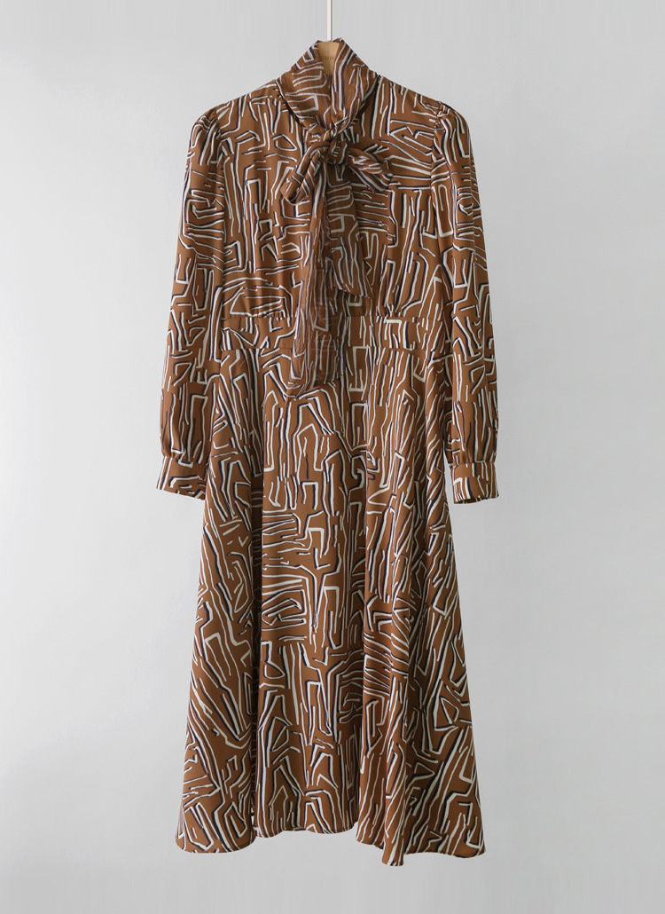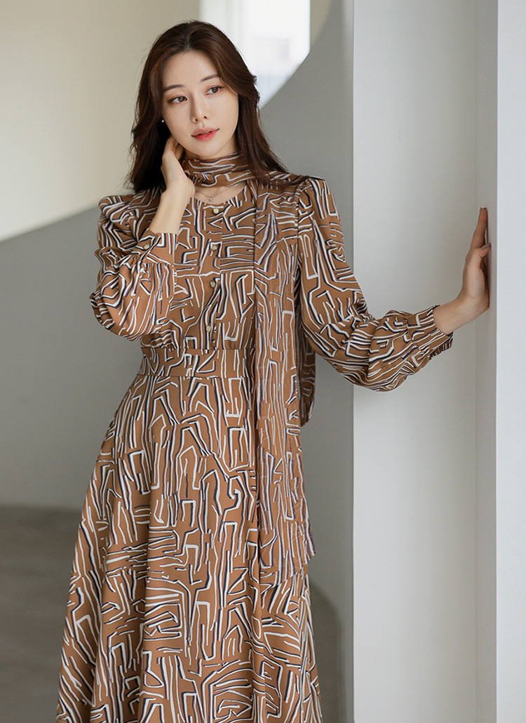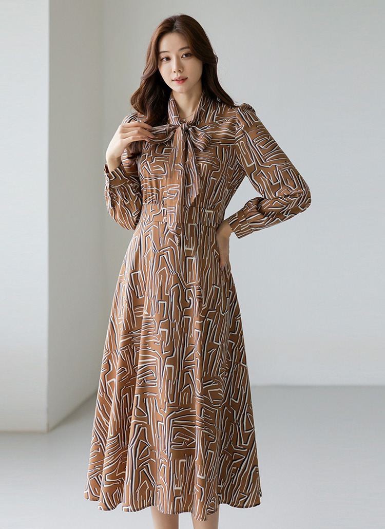 [LouisAngel] Geo Pattern Chiffon Tie-Neck Flare Dress