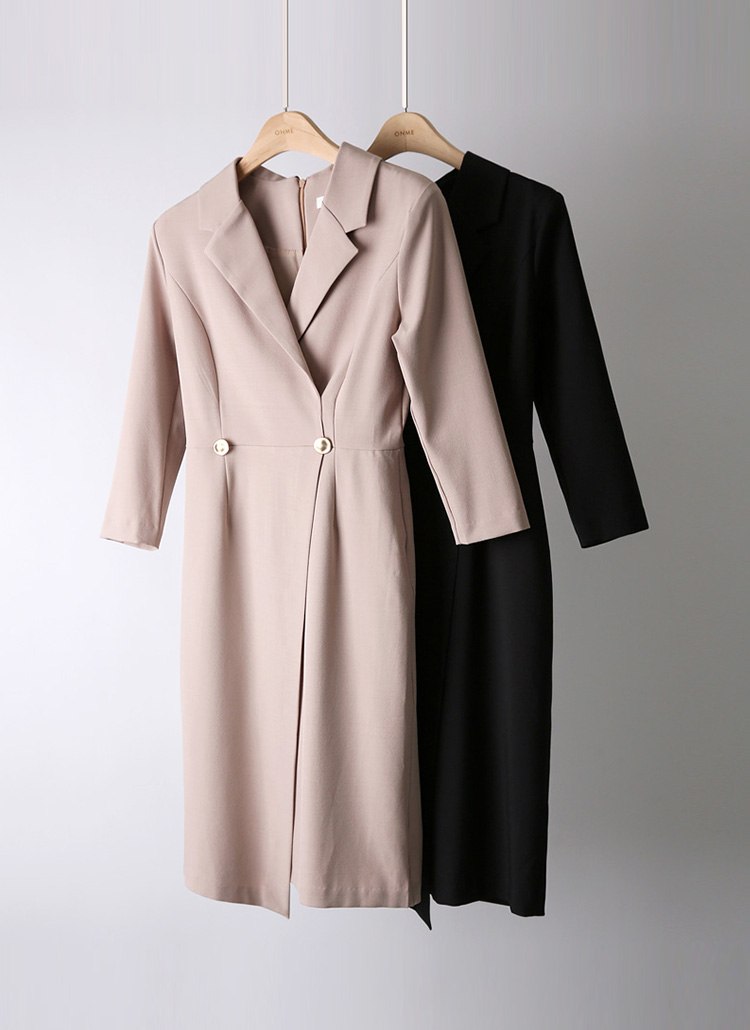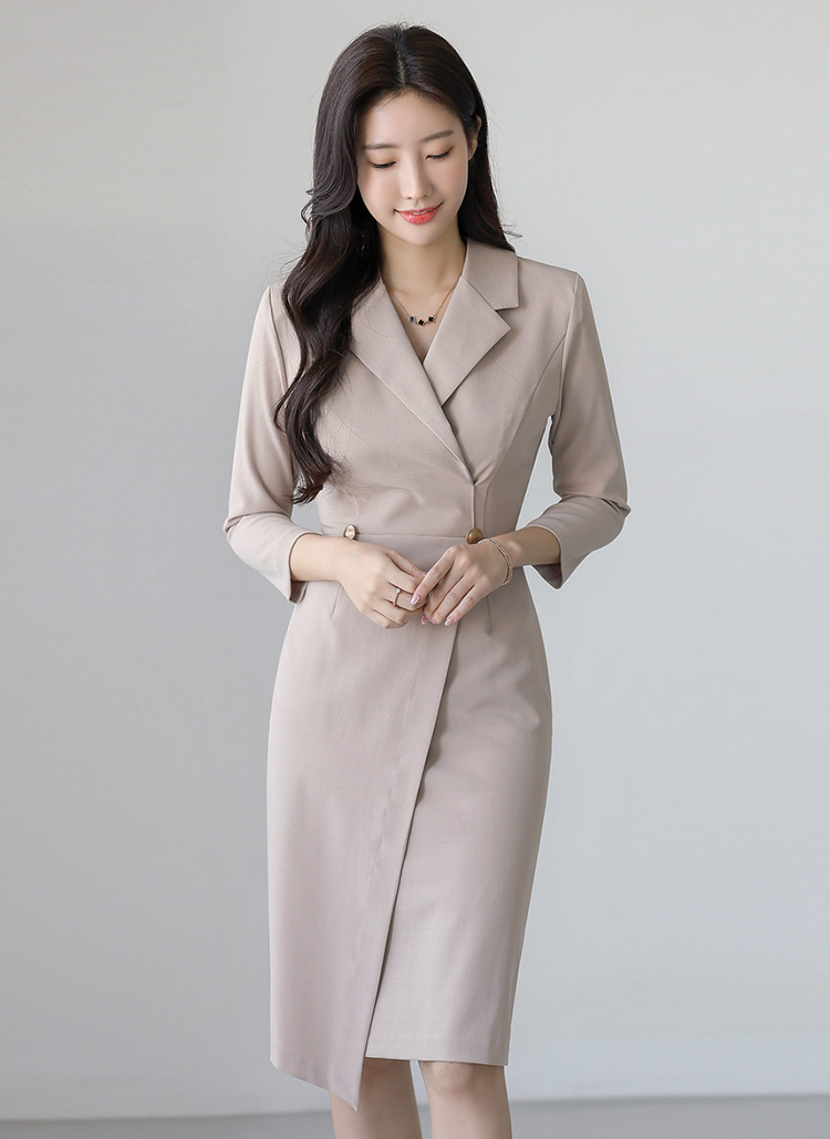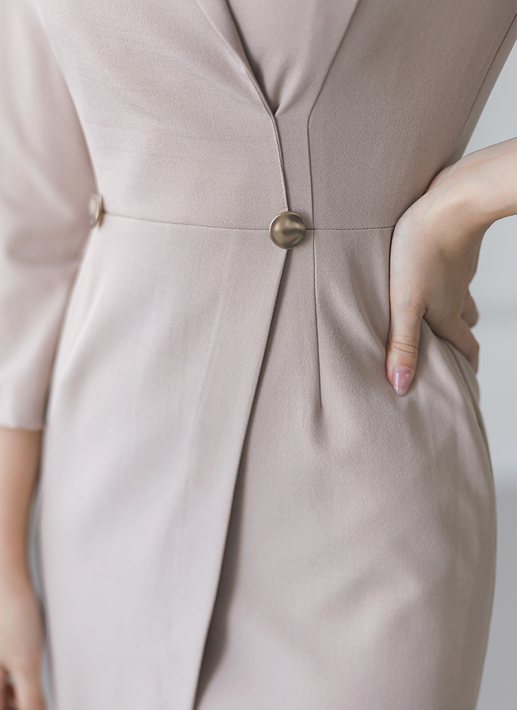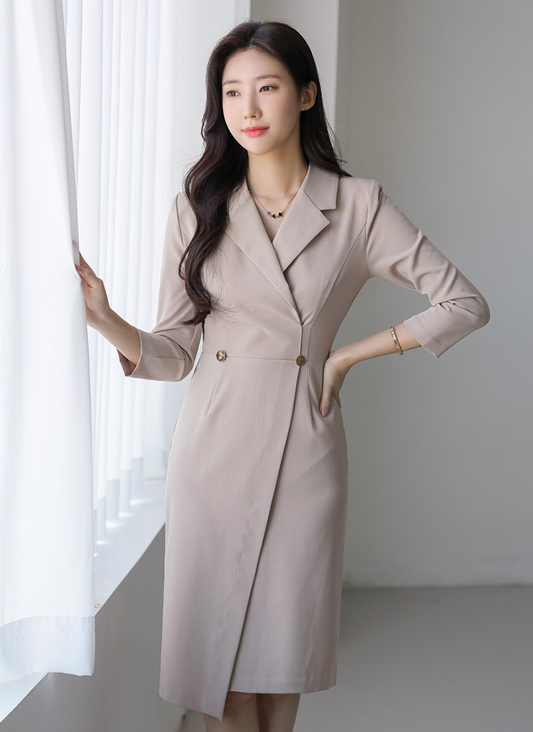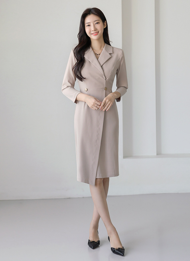 세련된 랩 카라 디자인에 언발 밑단으로 포인트를 준