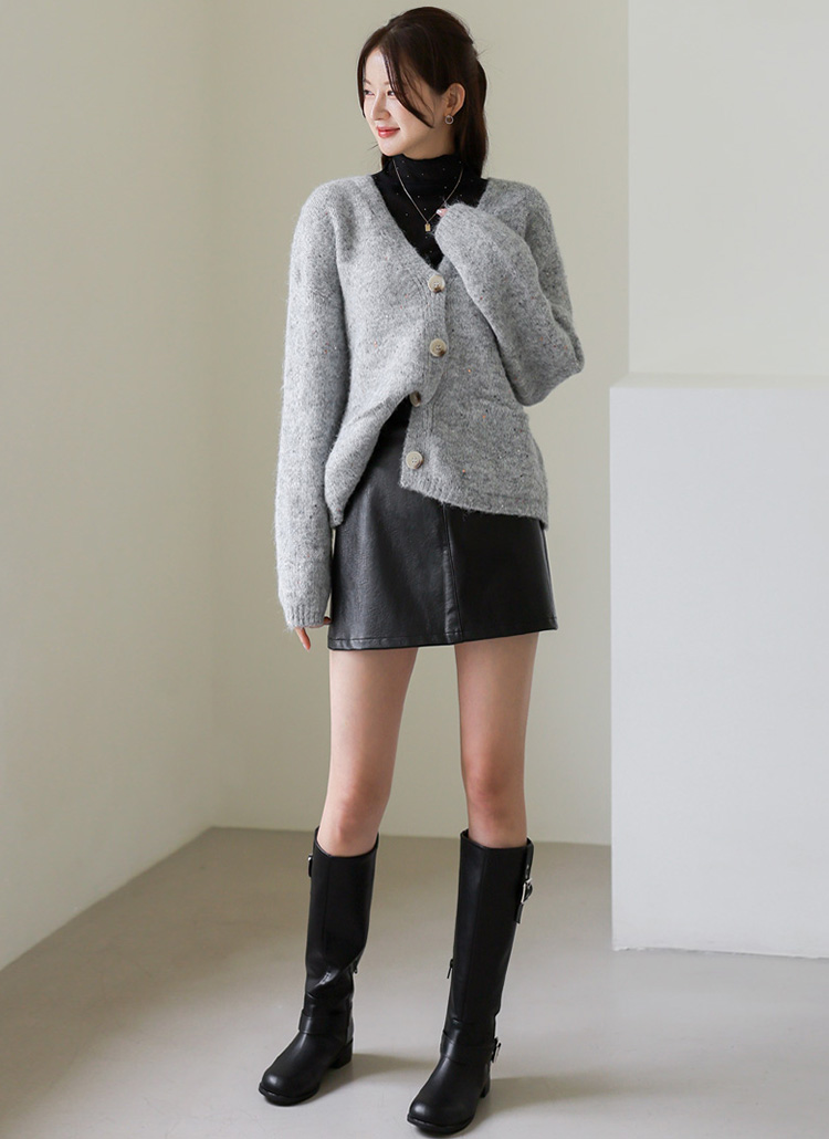 비침 없고, 안감 없으며, 두께감이 보통인 페이크 레더 스커트입니다