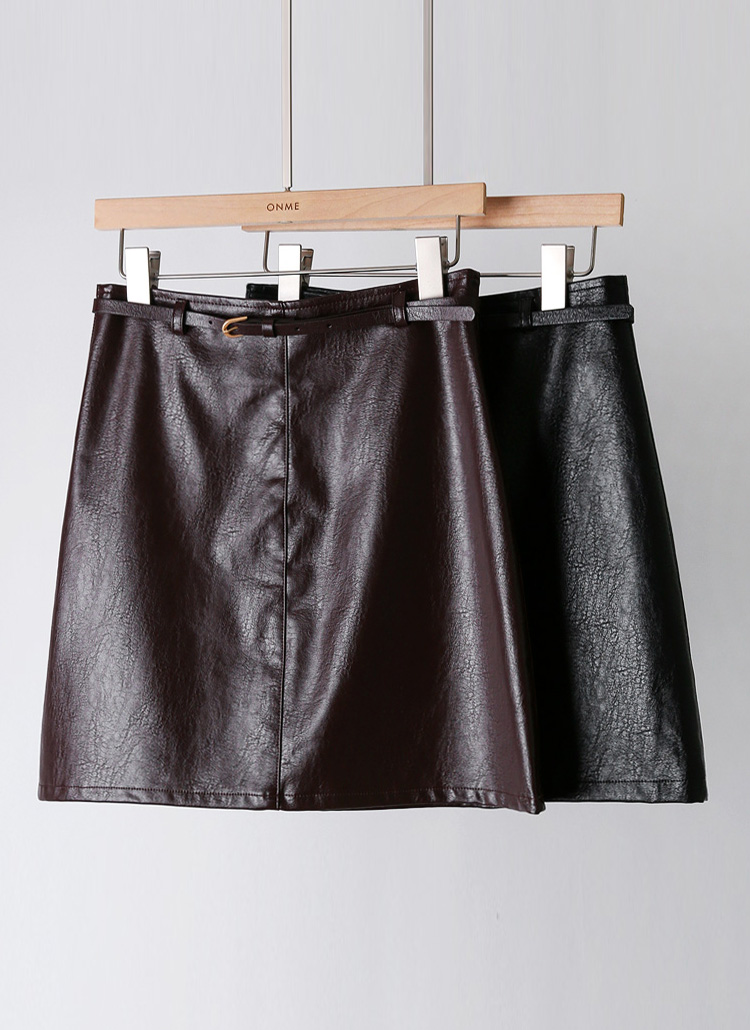 [The Onme] High Waist Simple Faux Leather Mini Skirt w/ Belt