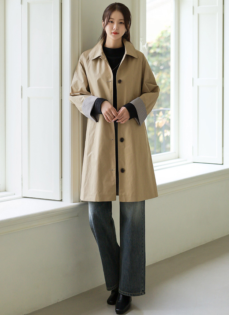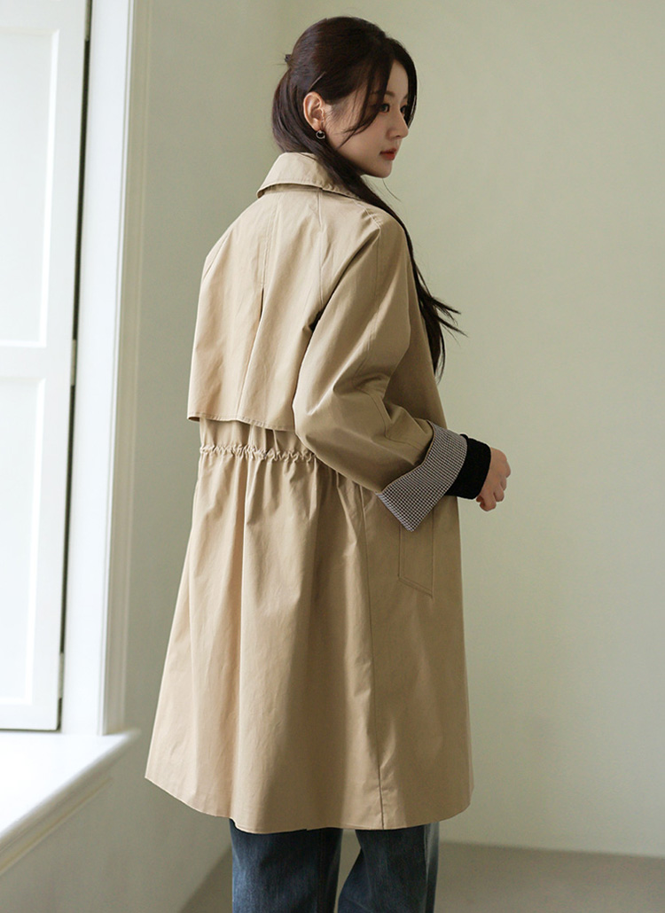 [The Onme] Drawstring Waist Check Roll-Up Cuff Trench Coat