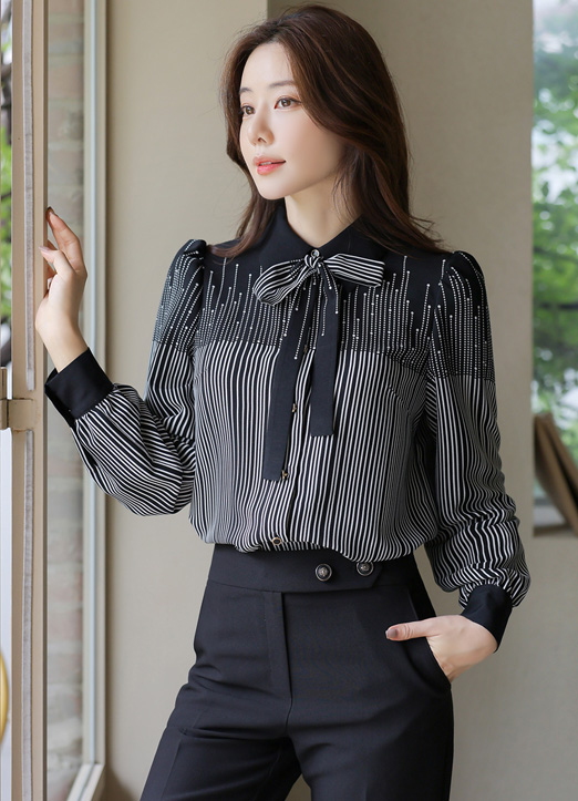 [Featuring a distinctive stripe pattern and tie-neck detail, this puff shoulder blouse offers polished charm and comfortable wear, pairing effortlessly with skirts or tailored pants.]