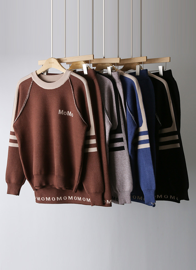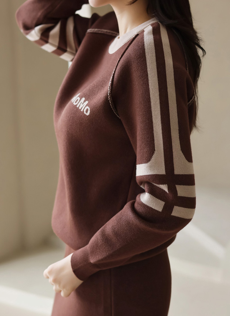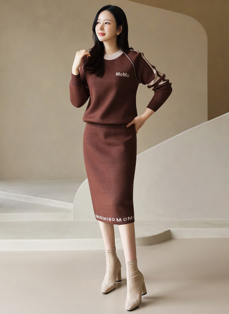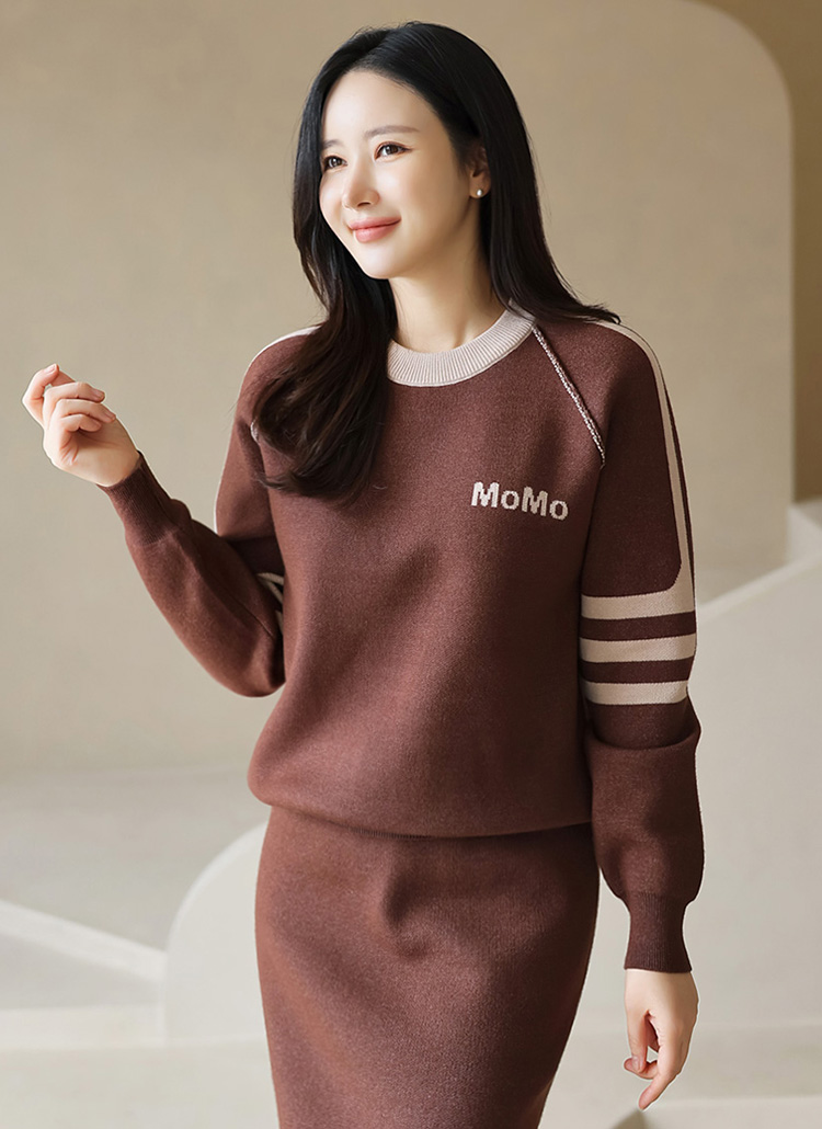 여유로운 품의 니트 맨투맨과 깔끔한 H라인의 니트 스커트가 세트로 구성되어