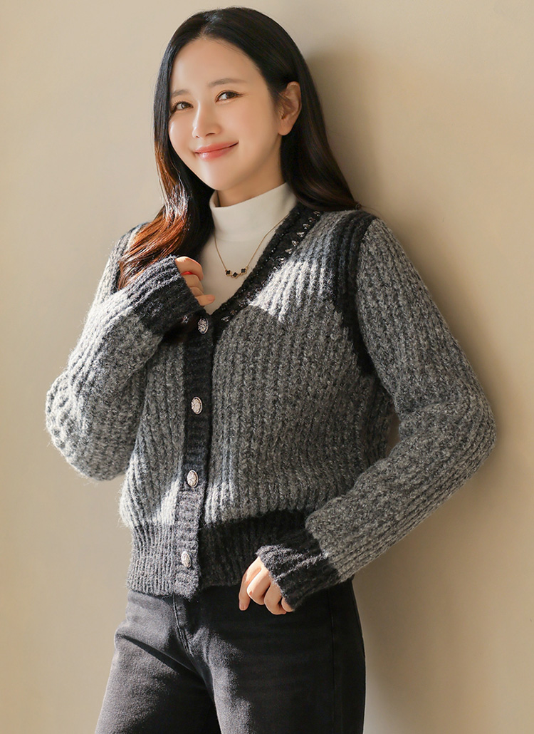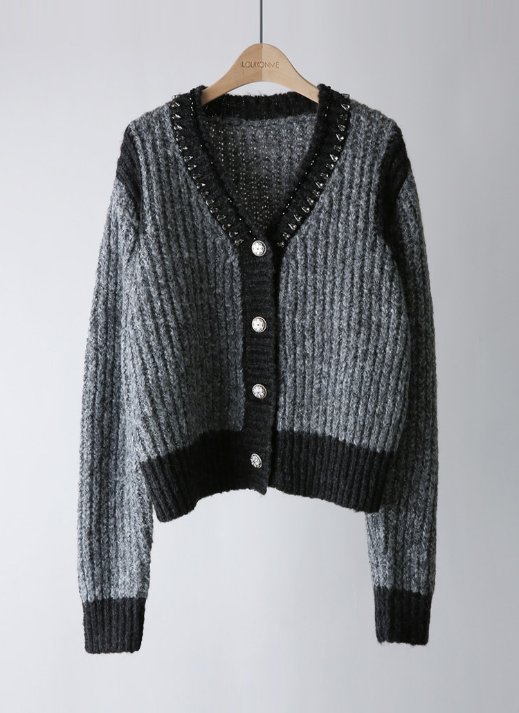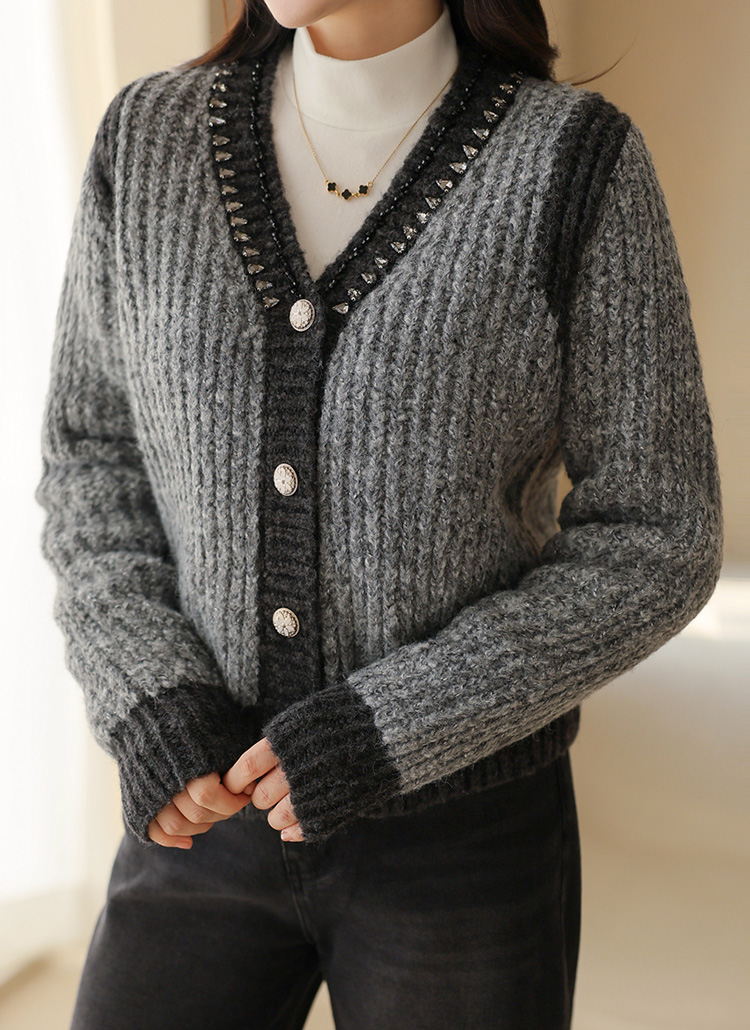 Rhinestone Embellished V-Neck Knit Cardigan
