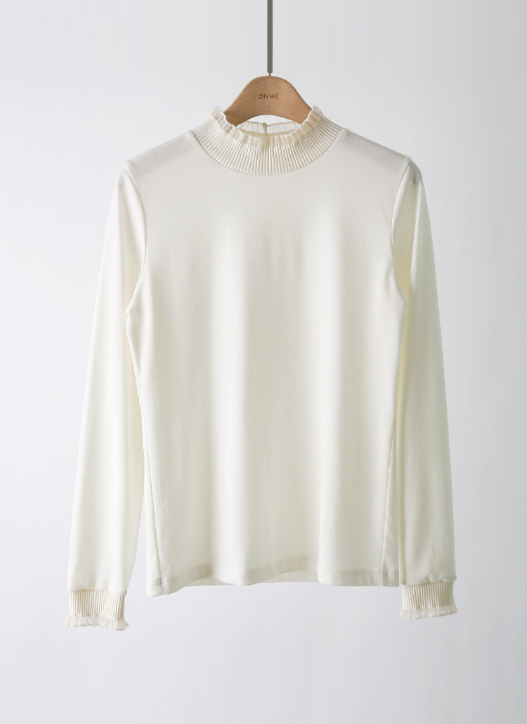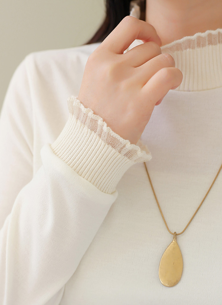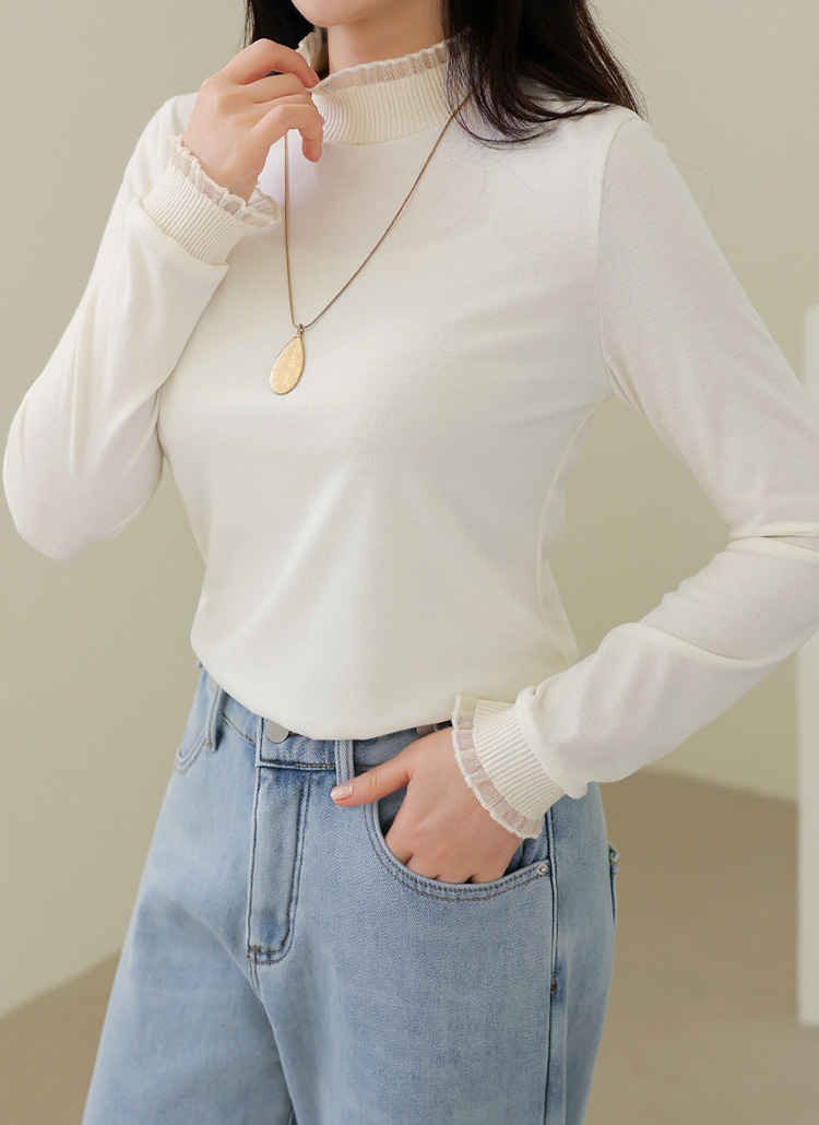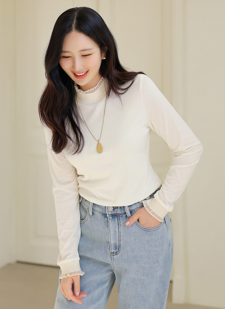 프릴 배색이 돋보이는 반하이넥 티셔츠로