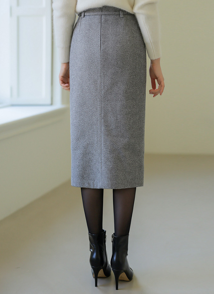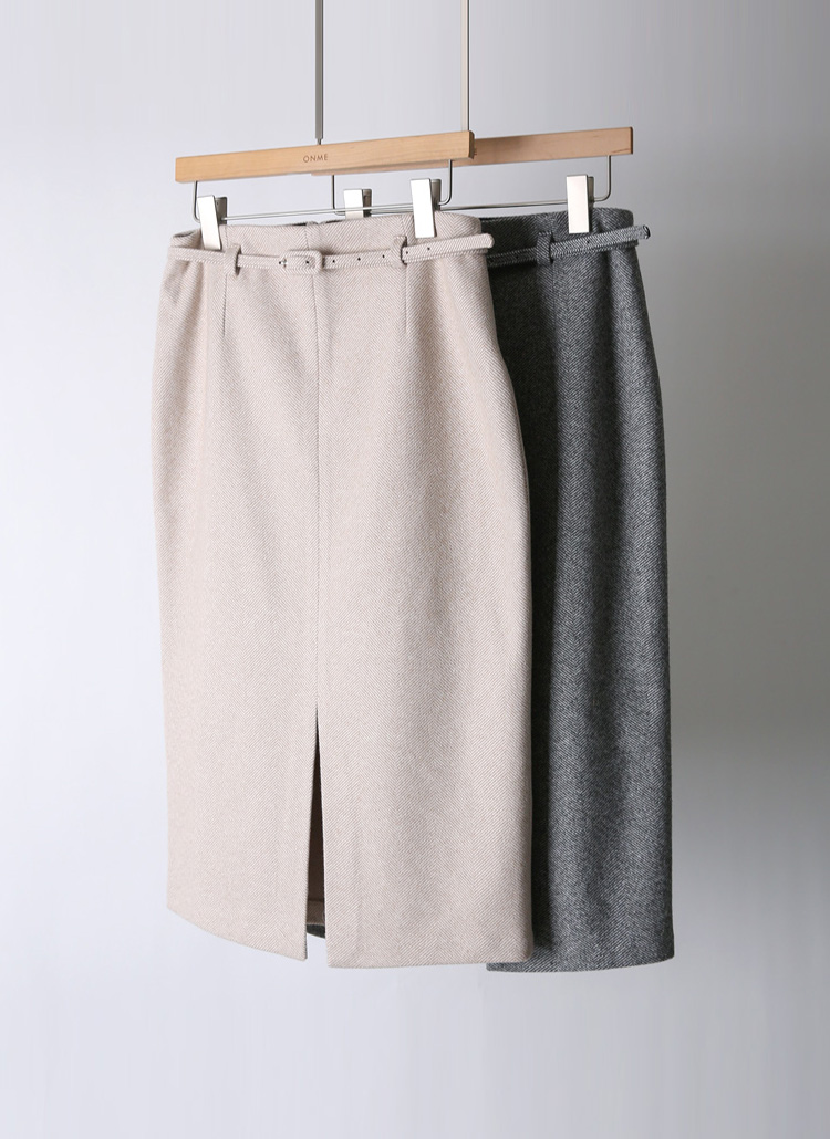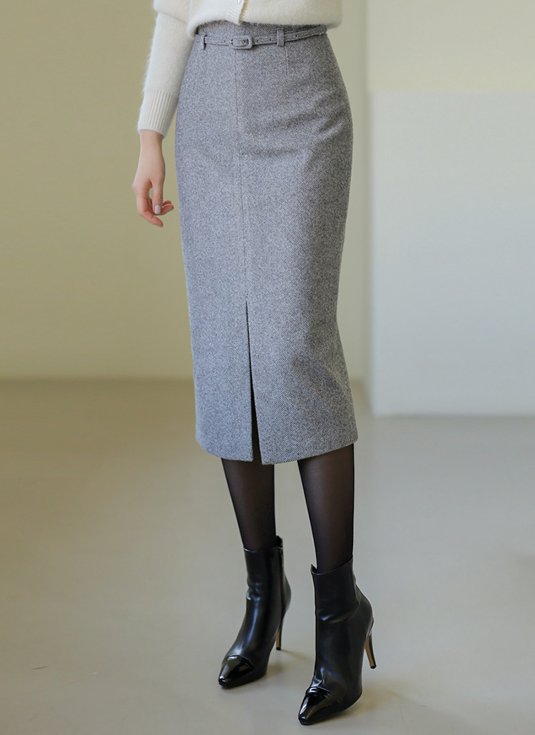 Wool Blended Front Long Slit H-Line Skirt w/ Belt