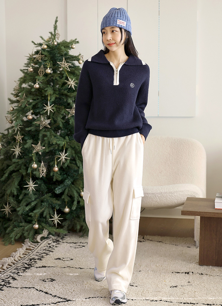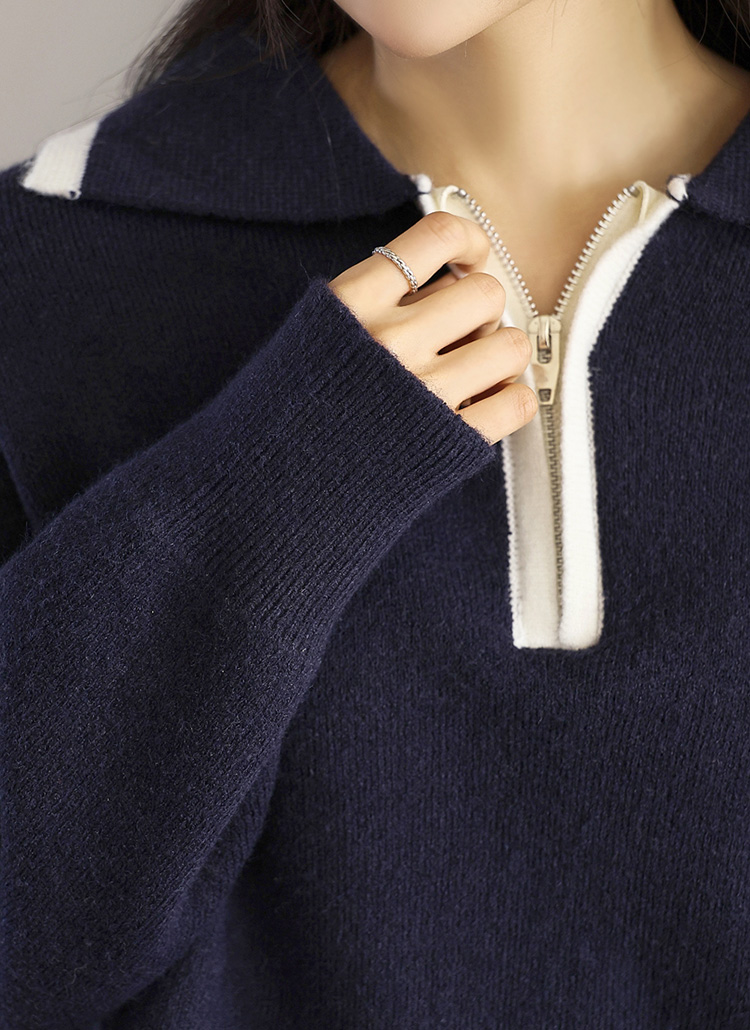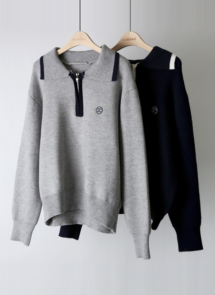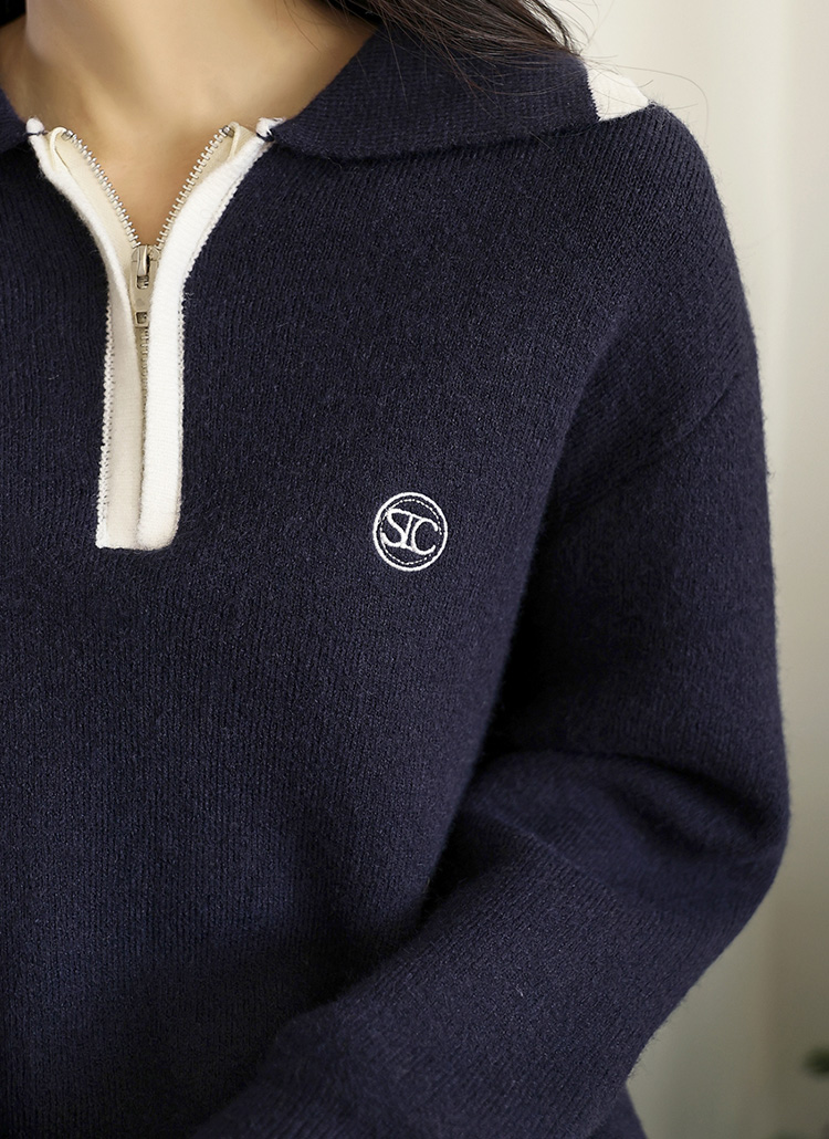 [The Onme] Contrast Trim Half Zip-Up Knit Top