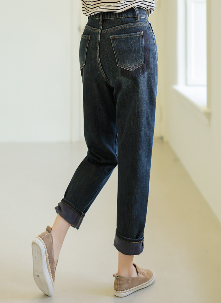 따뜻한 융 기모 안감으로 겨울철에도 포근하게 착용하기 좋은 세미 배기 데님 팬츠에요 :)