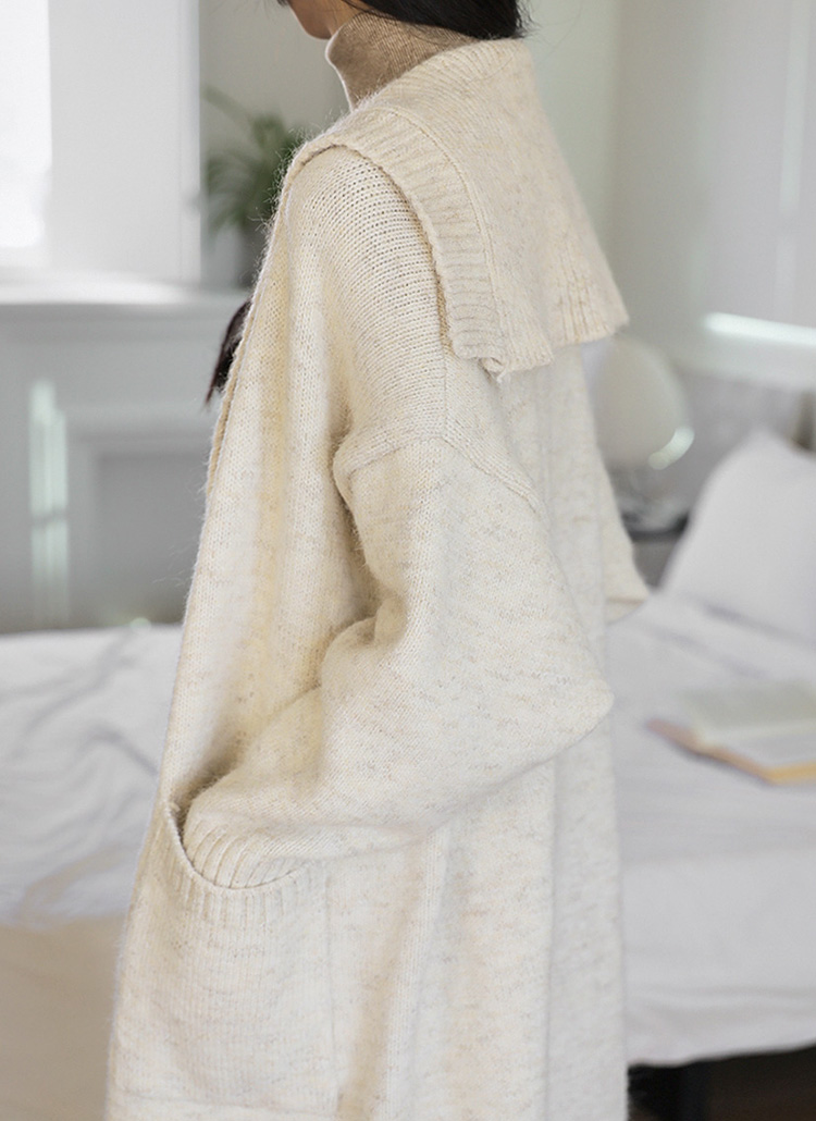 [The Onme] Ribbed Trim Sailor Collared Long Knit Cardigan