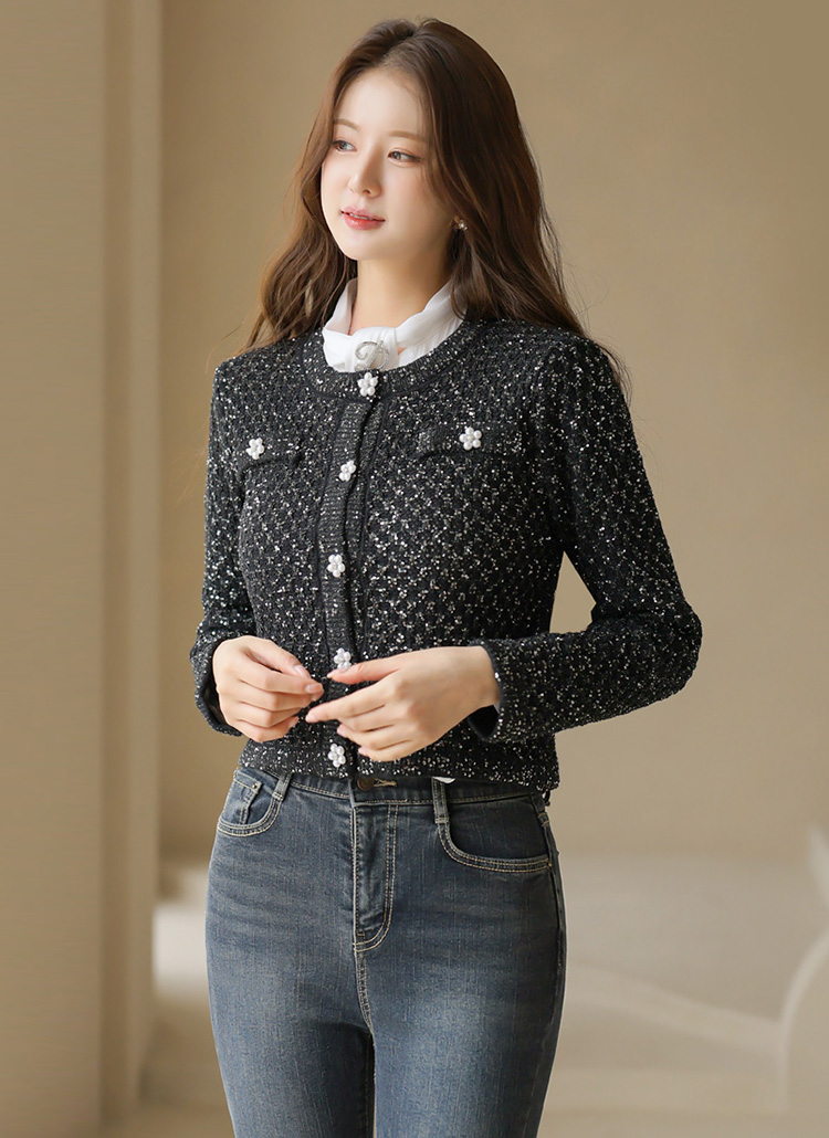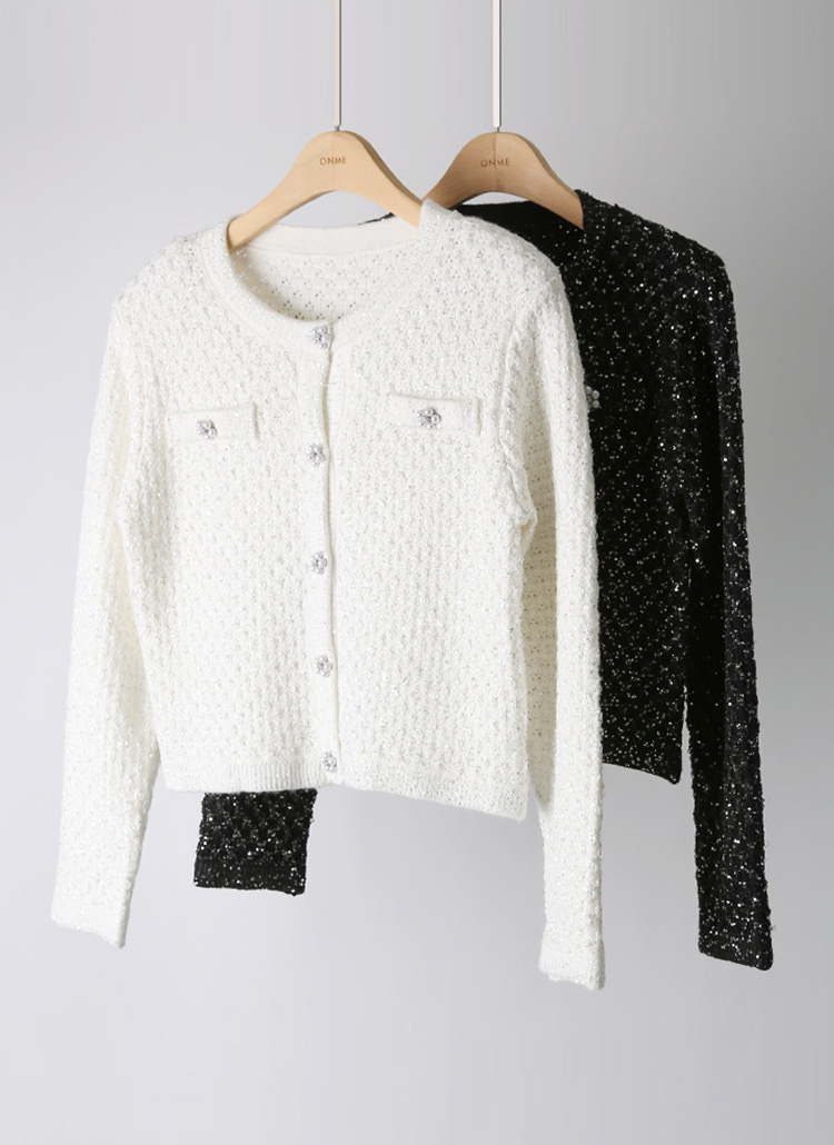 진주 버튼이 돋보이는 글래링 진주플라워 버튼 스팽글 펄 다이아 쟈가드 가디건이에요 :)
