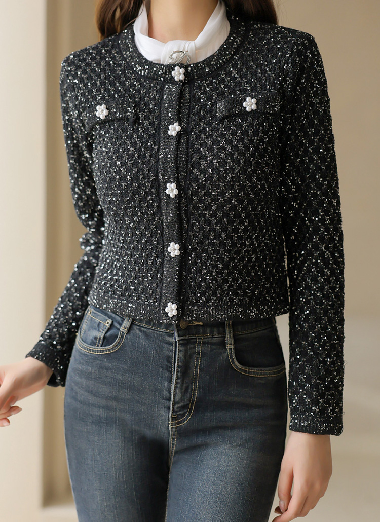 [Accented with intricate sequins and pearl buttons, this cardigan offers a luxurious, comfortable fit with timeless appeal.]