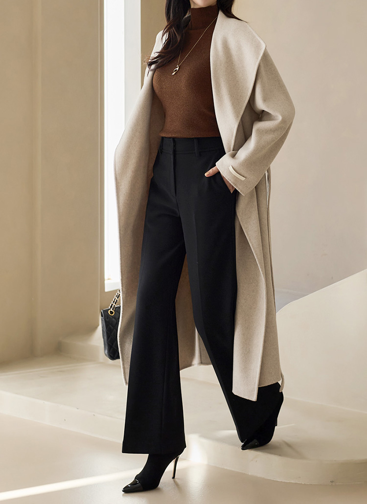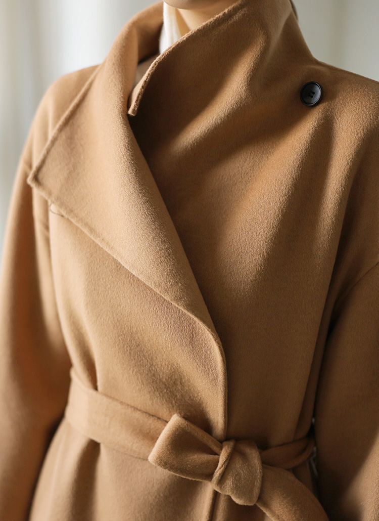 [Perfectly blending warmth and style, this coat showcases a wide shawl collar, high-neck adaptability, and a flattering belted waist.]