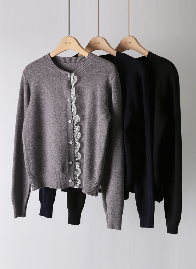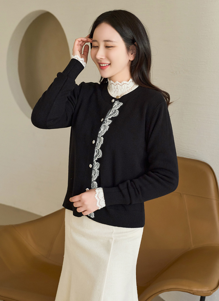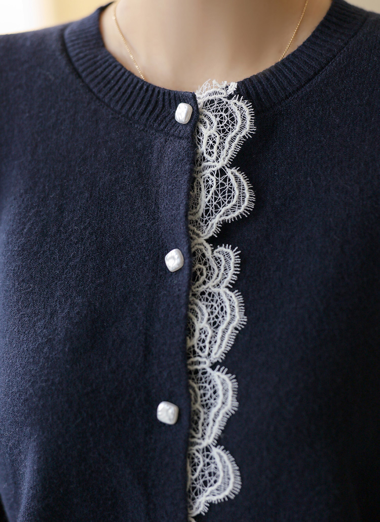 [A soft and versatile knit cardigan with a round neck and lace trim detailing, complemented by unique square pearl buttons.]
