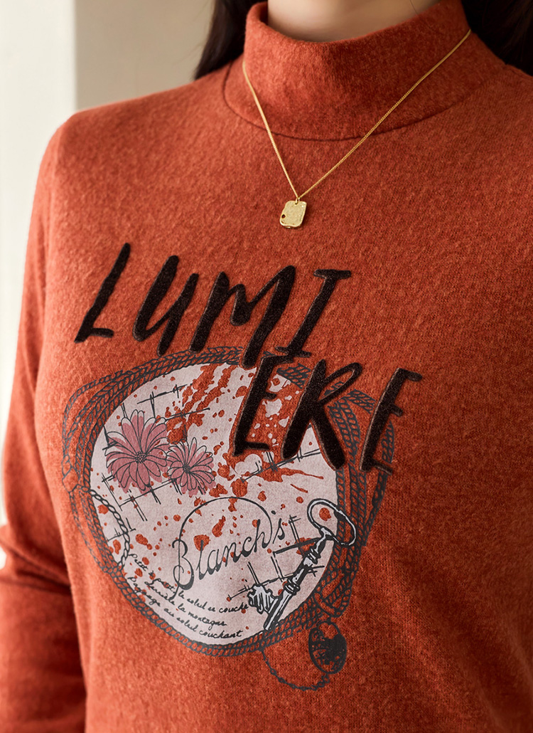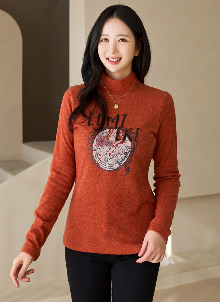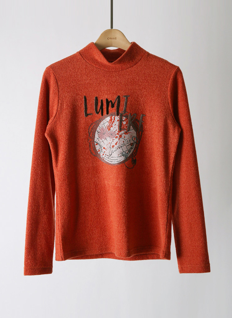 [LouisAngel] Burnt Orange Graphic Mock Neck Top