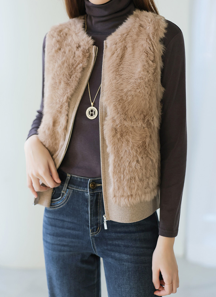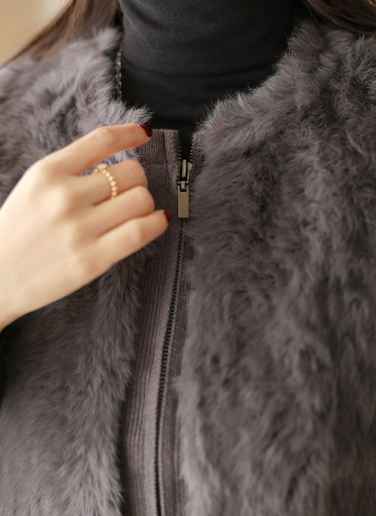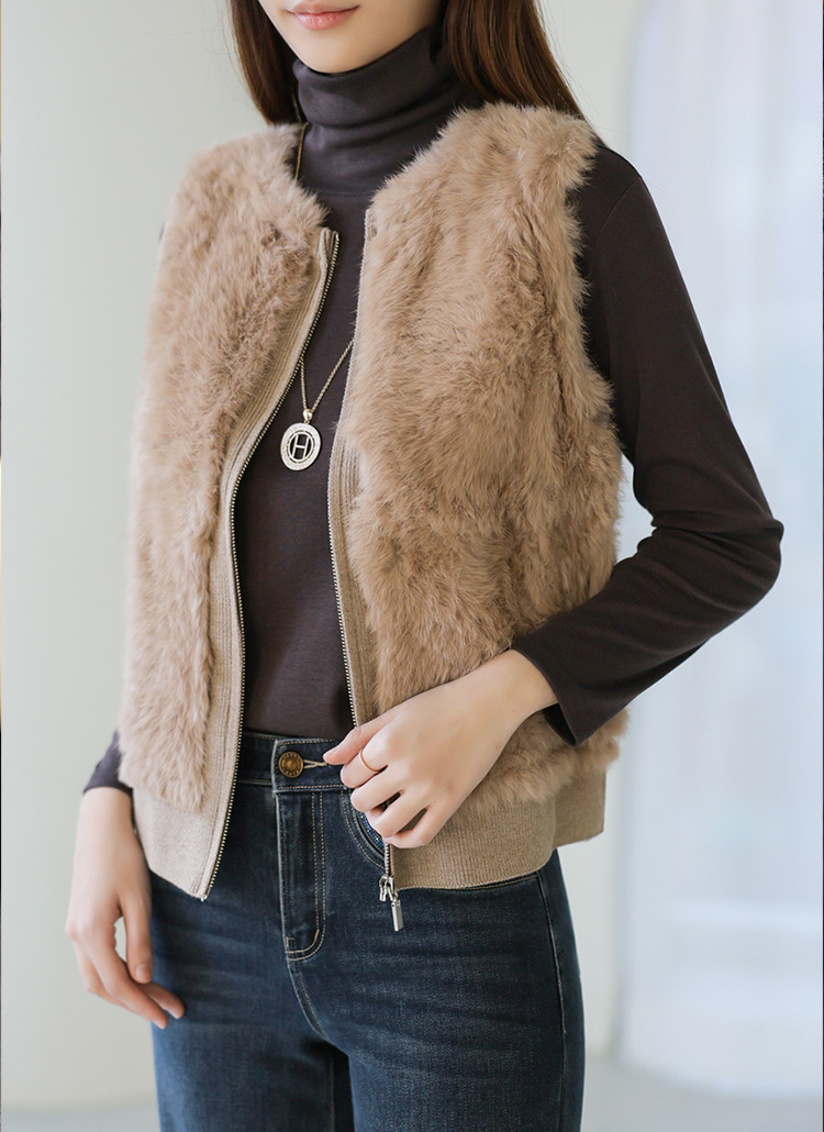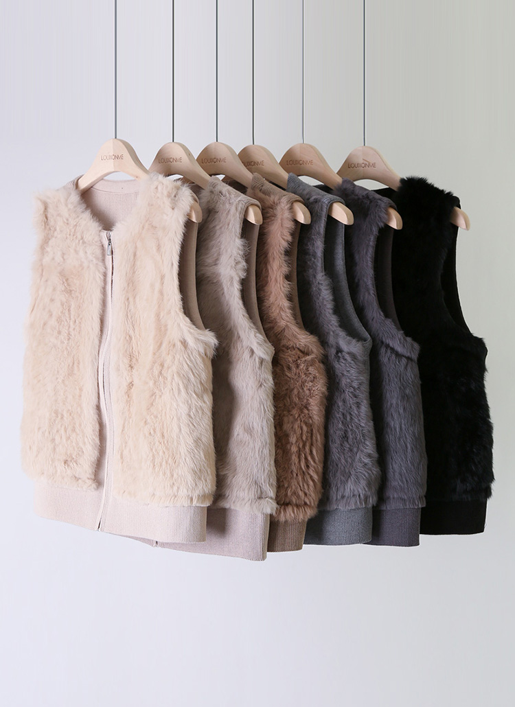(6 Colors) Rabbit Fur-Trimmed Knit Zip-Up Vest