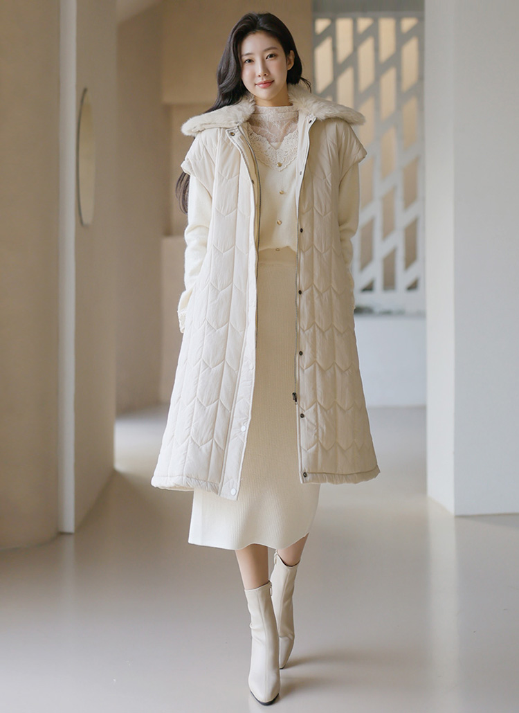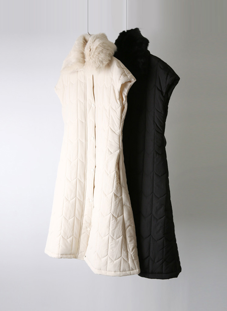 [Style it as a chic dress or a cozy vest, complete with a detachable rabbit fur collar and elastic belt.]