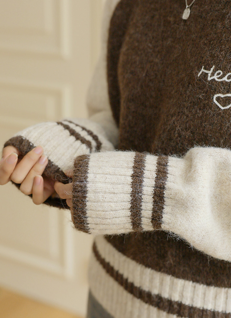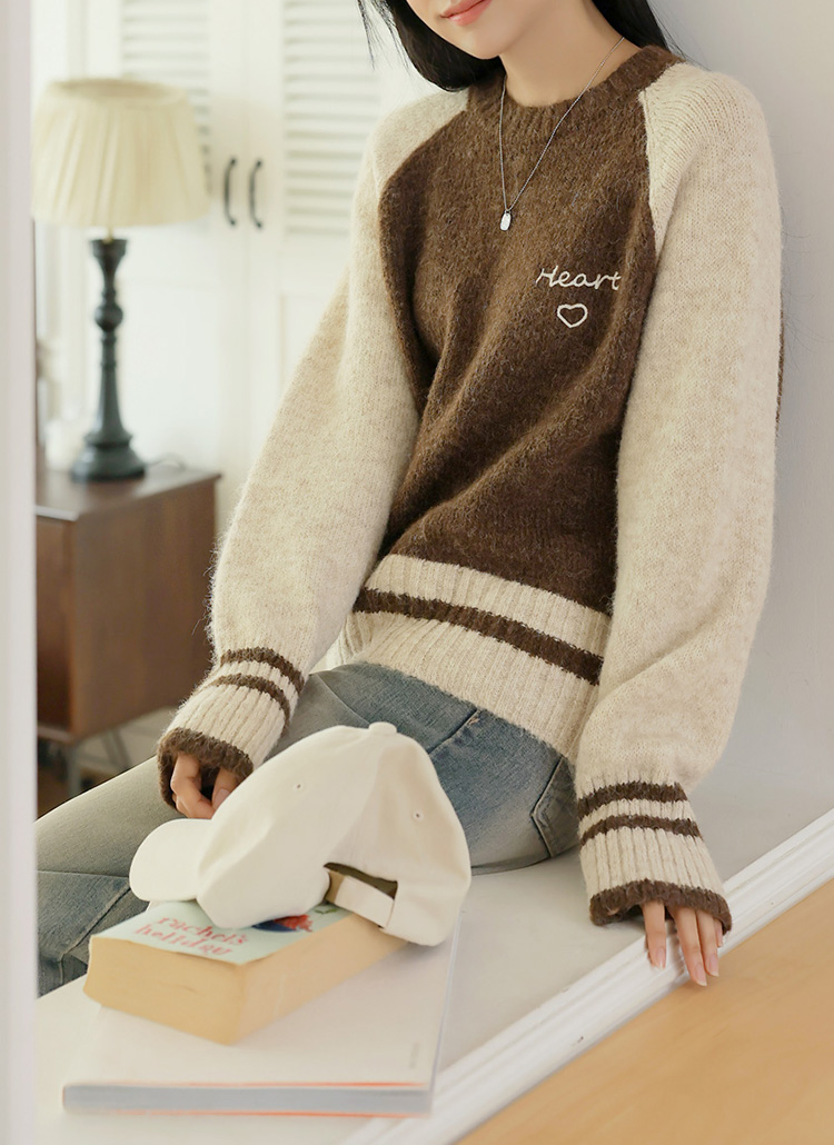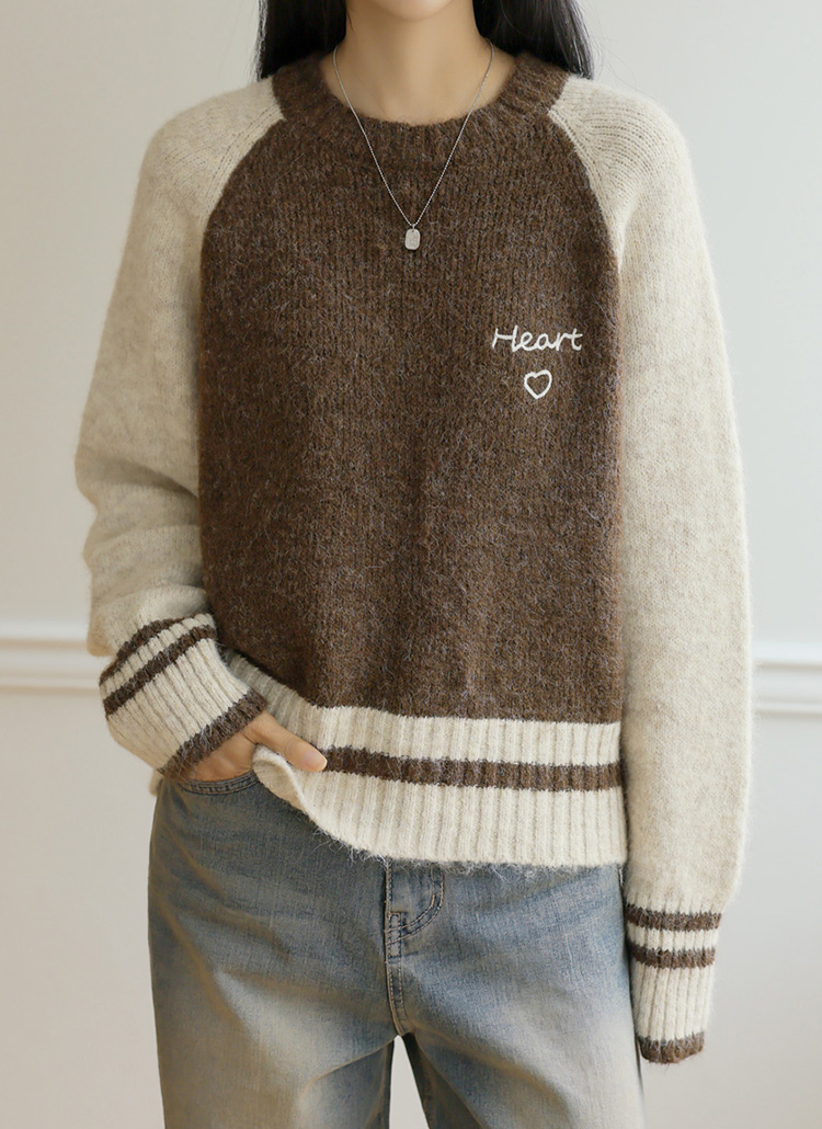 [A cozy wool-blend sweater with playful heart embroidery and a trendy color-block raglan design.]