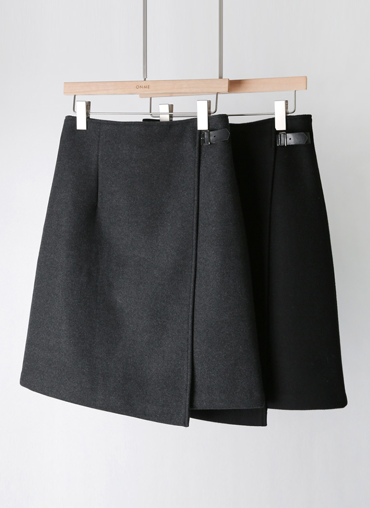 [A chic wrap-style midi skirt with a side leather strap accent and a cozy wool-like fabric for winter warmth.]