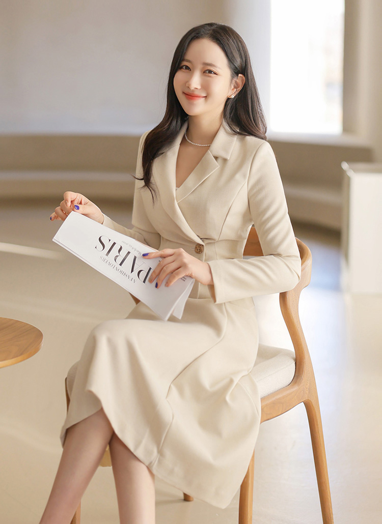 [A sophisticated flare dress with a tailored jacket-inspired design for a polished look.]