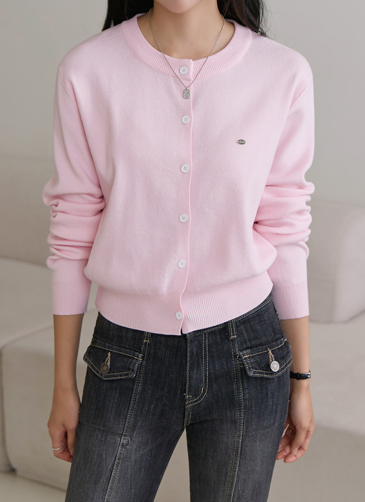 [A sleek round-neck cardigan with a refined silver pendant accent, offering a classic fit and polished silhouette for versatile styling.]