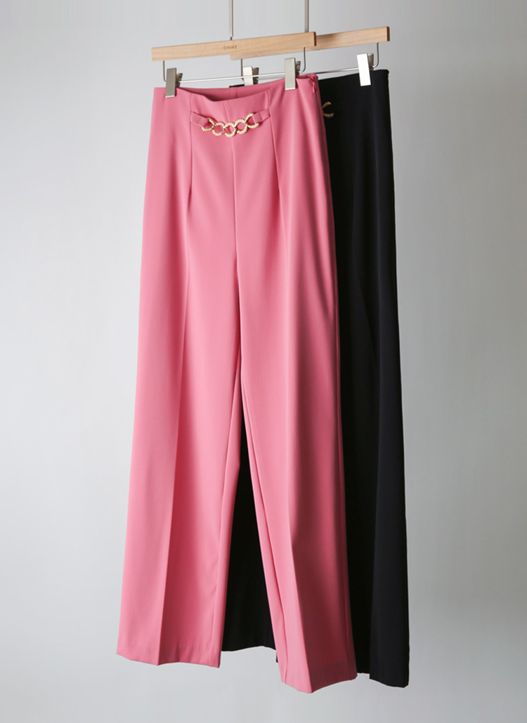 [With a subtle sheen and gold chain detail, these wide slacks exude effortless elegance and elongate the legs.]