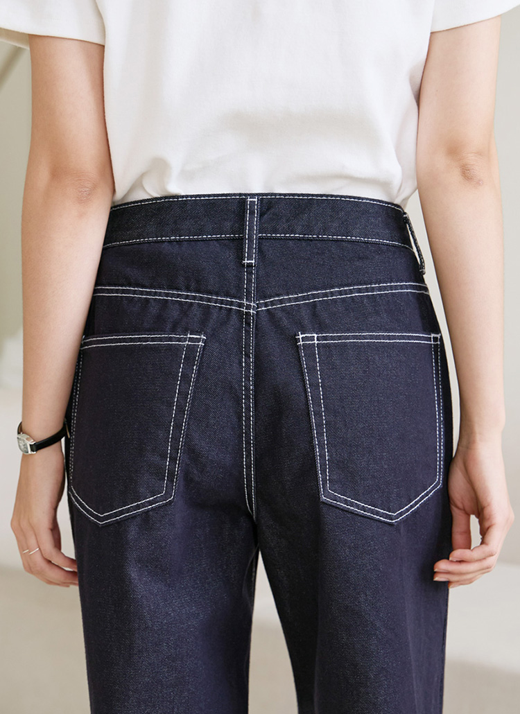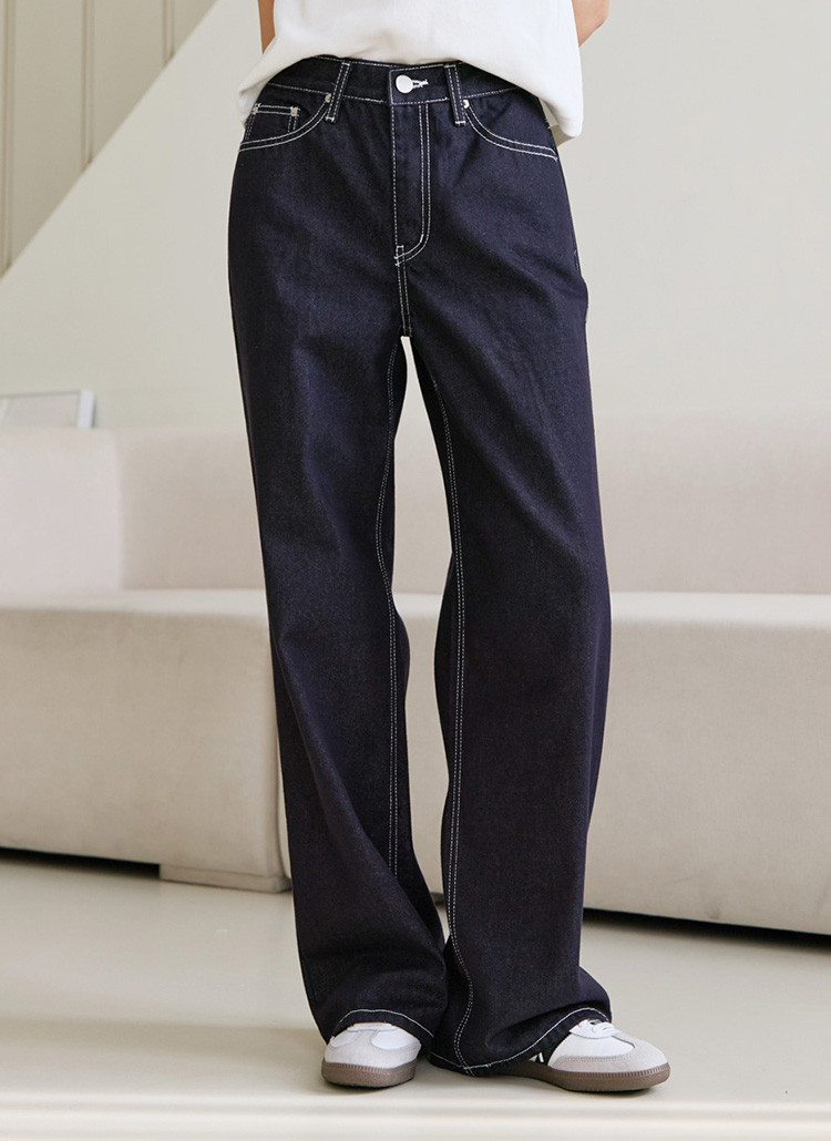 [With clean white stitching and a flattering wide fit, these durable cotton jeans offer style without fading worries.]