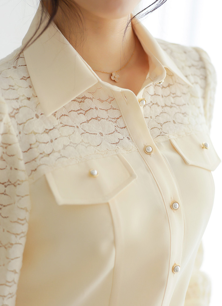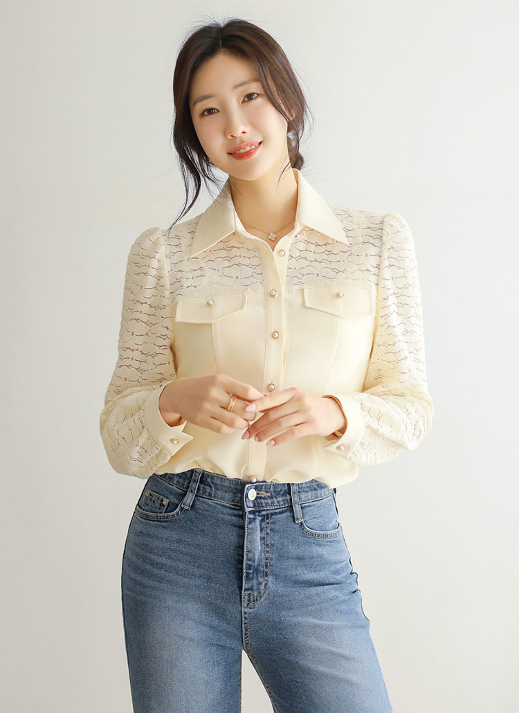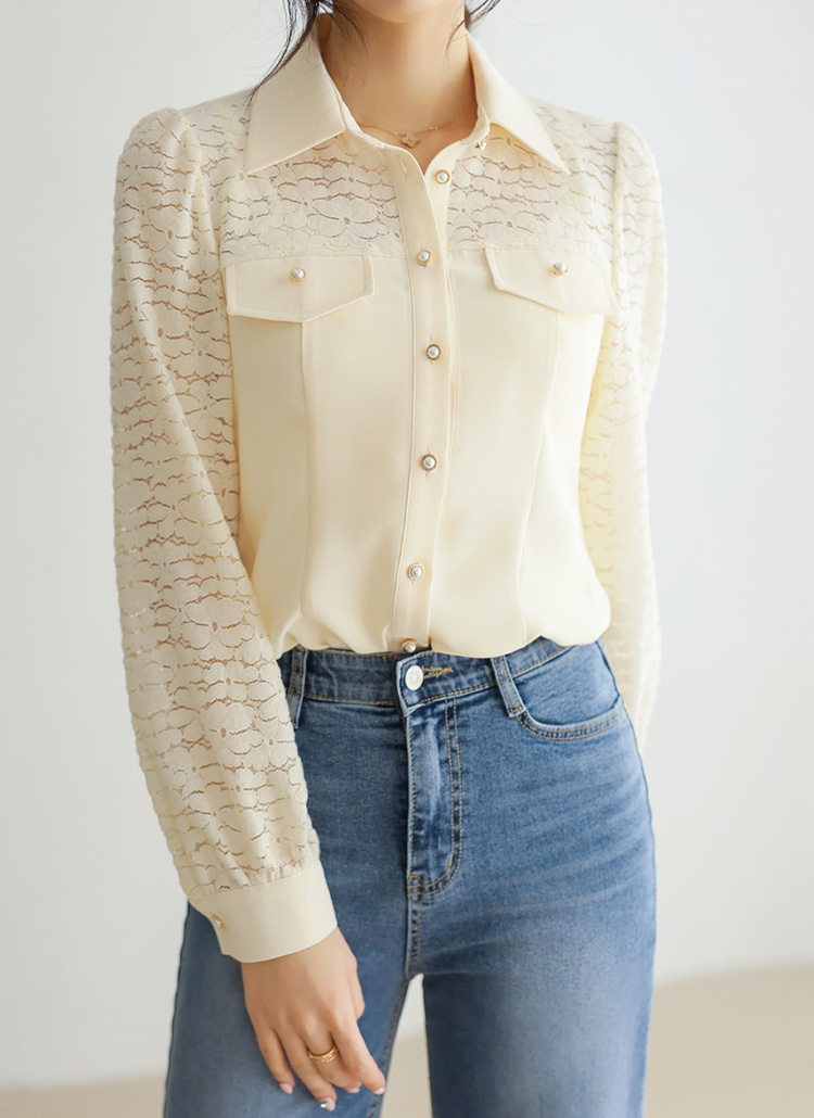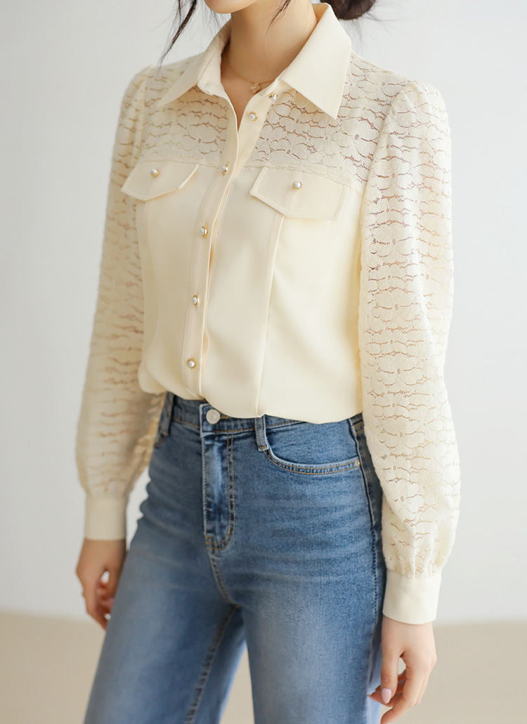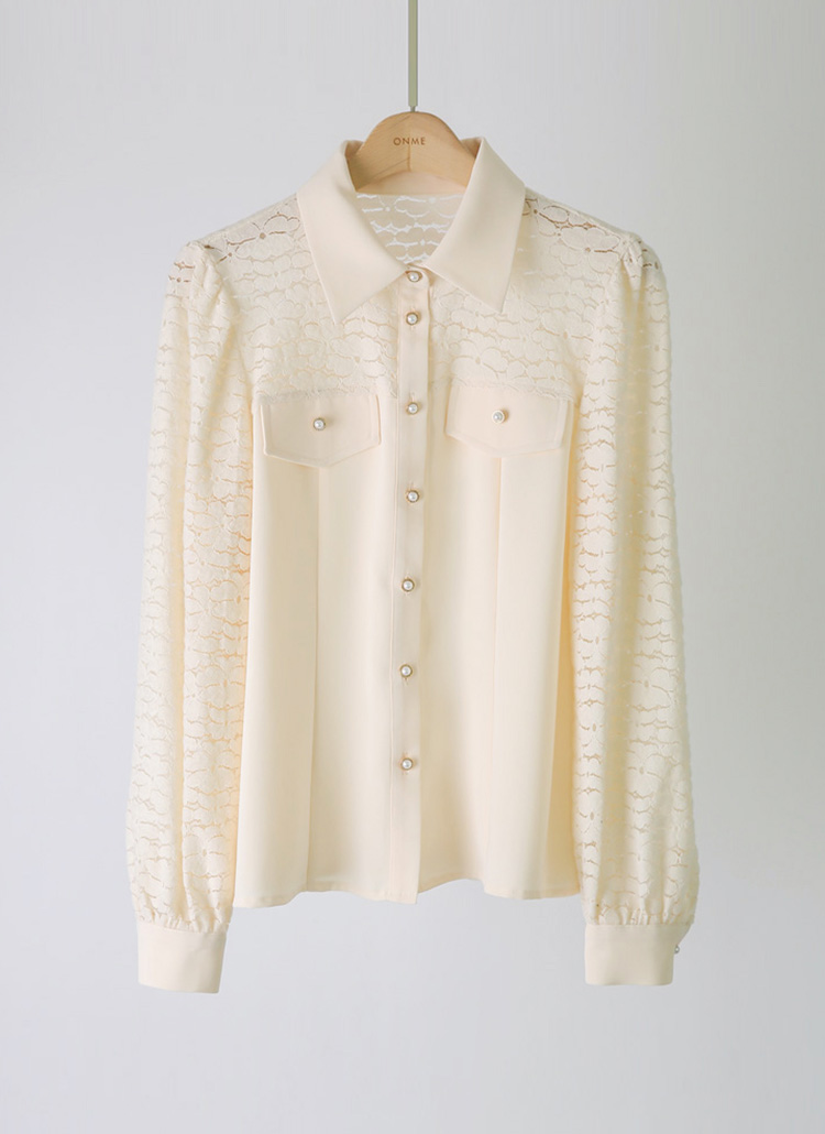 [With dreamy lace paneling and a creamy hue, this blouse creates an effortlessly elegant silhouette.]