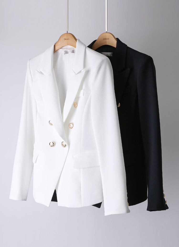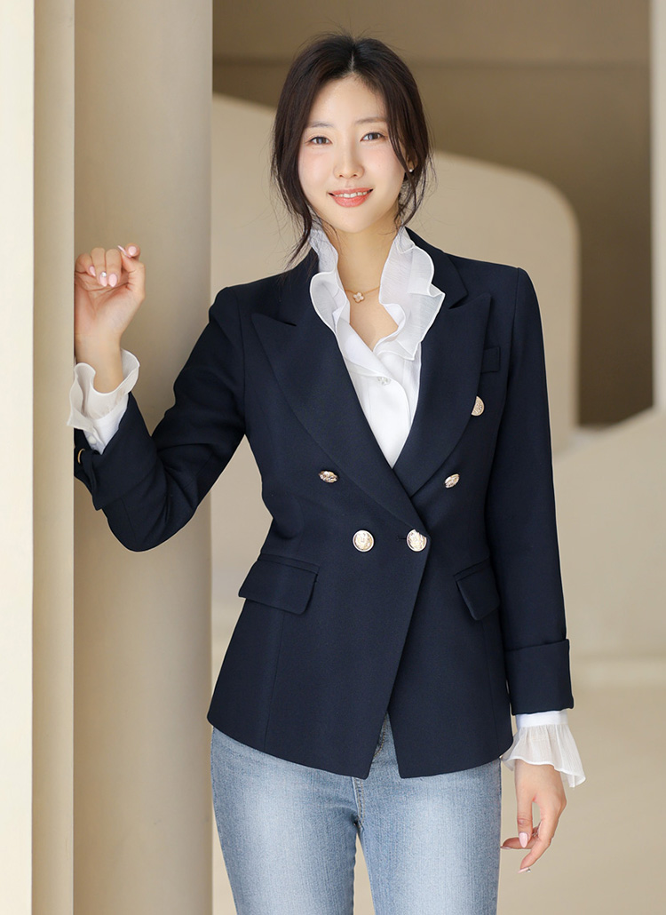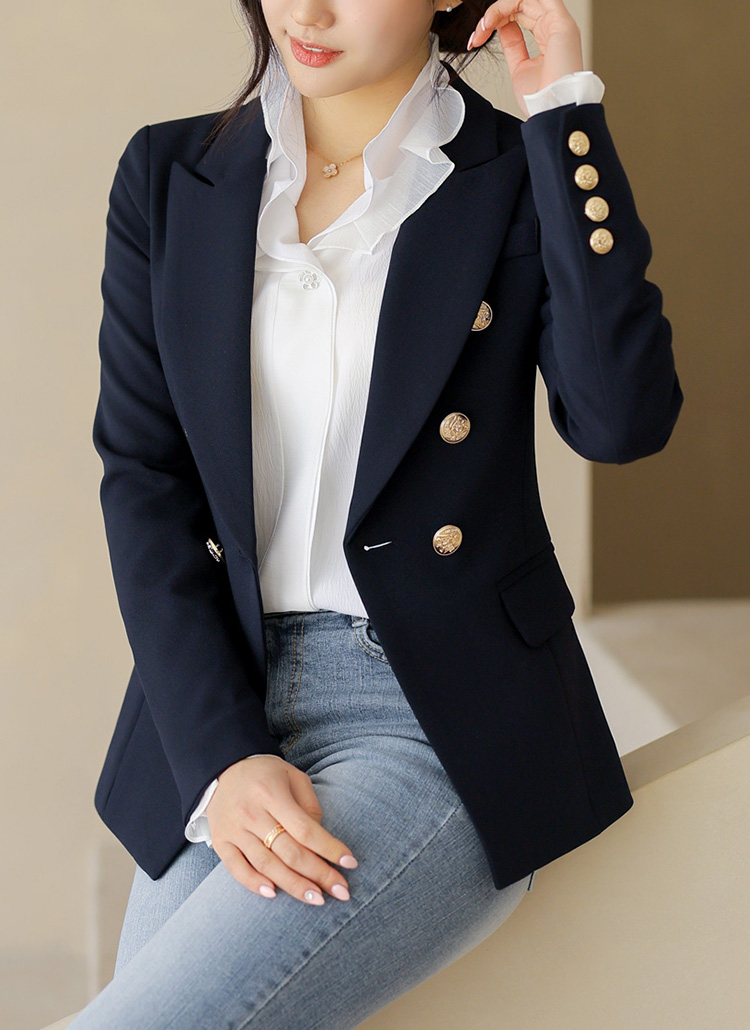 테일러드 칼라와 더블 버튼 디자인으로
