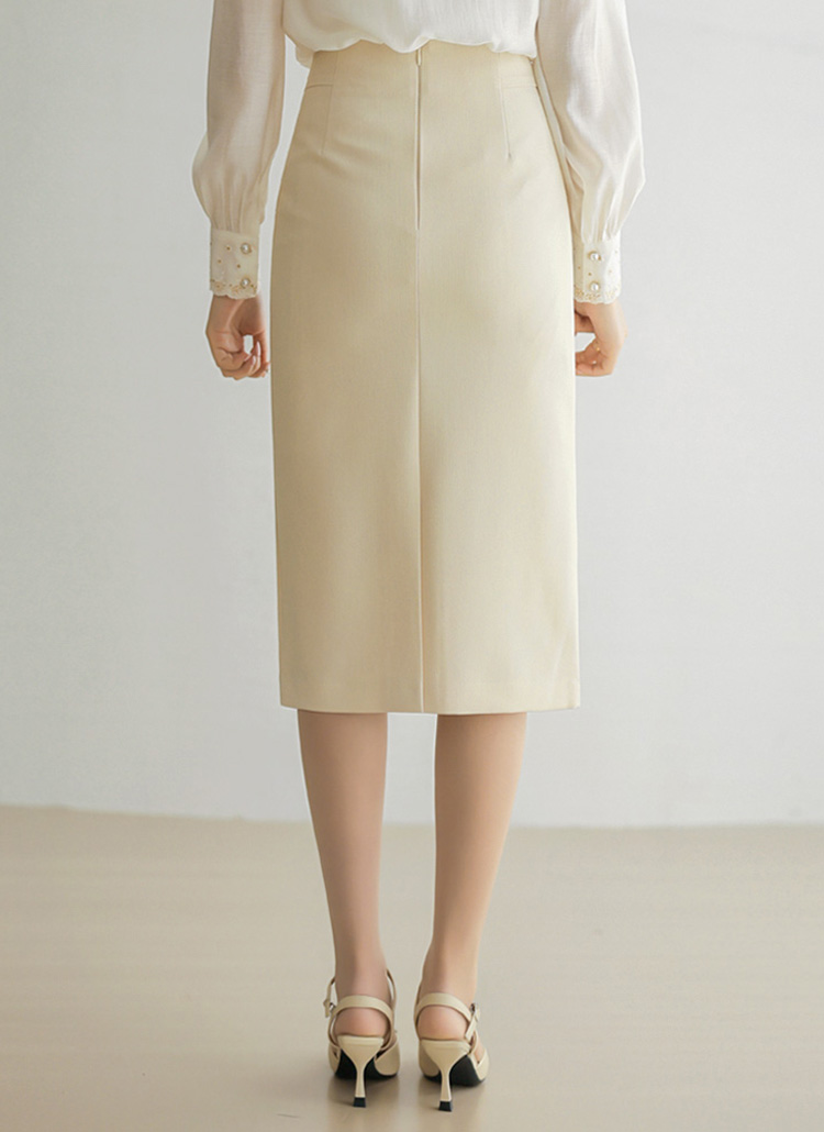 [A chic midi skirt with double buttons, a hidden front slit for ease of movement, and a tailored waistline for a sleek silhouette.]