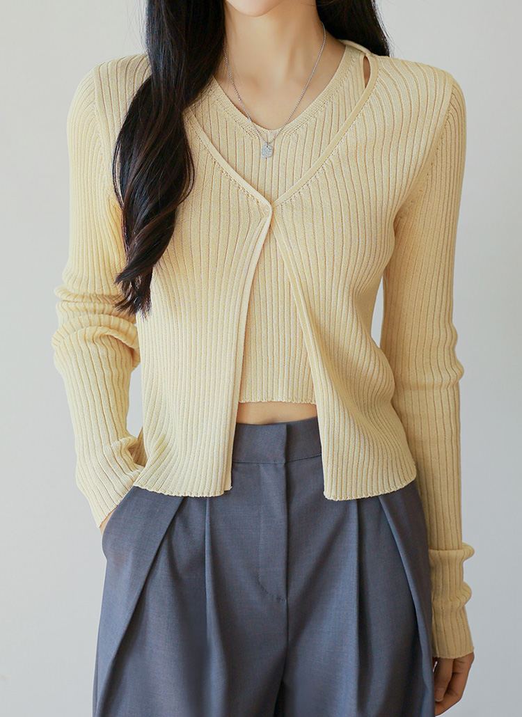 홀터넥 나시와 원버튼 가디건이 레이어드되어