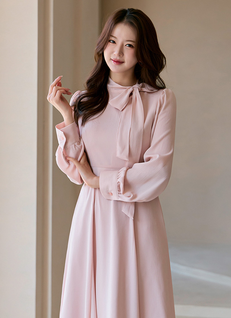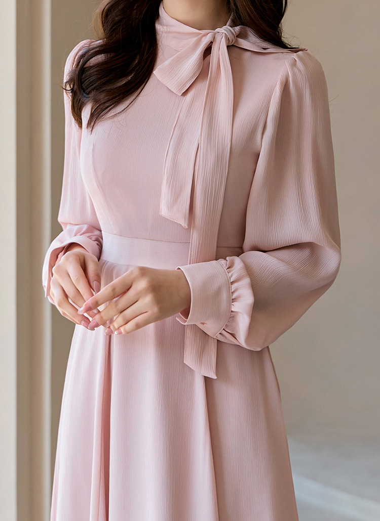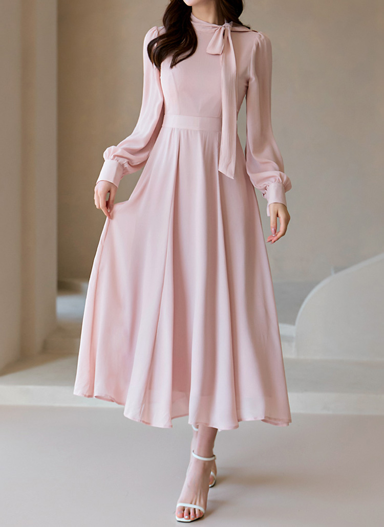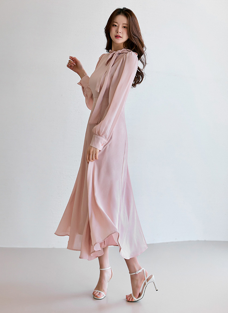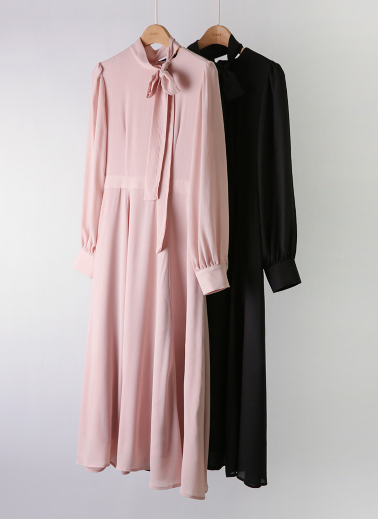 [A dreamy long chiffon dress with a tie-neck, voluminous sleeves, and a graceful A-line silhouette.]