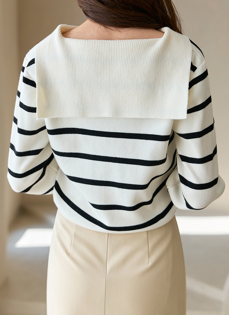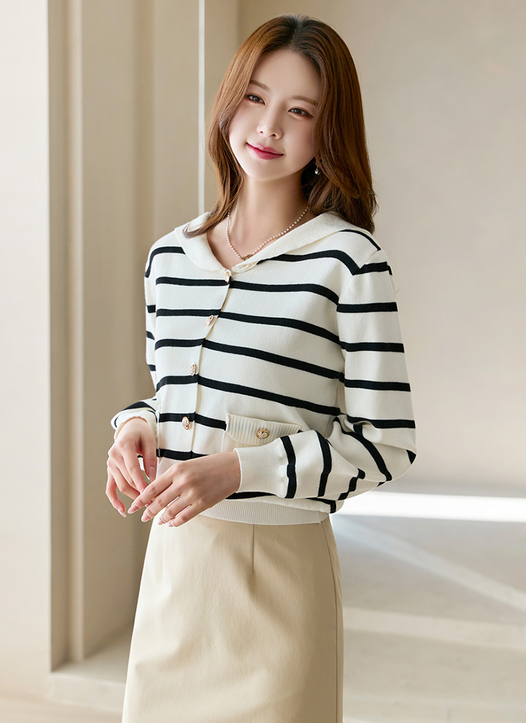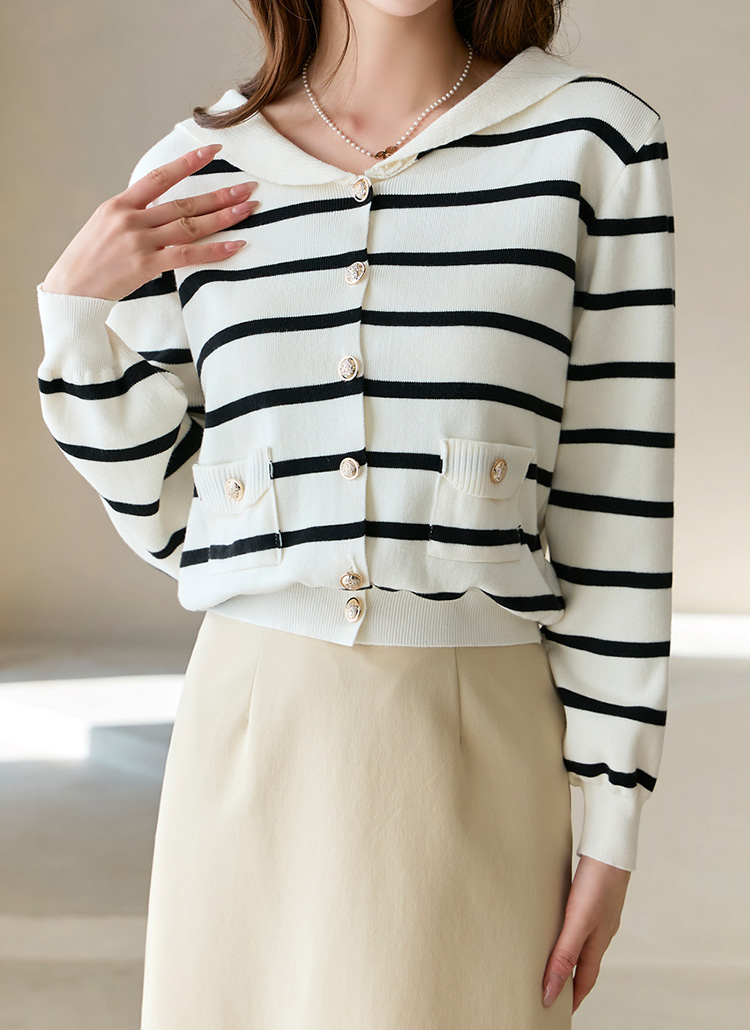 [Elegant sailor collar cardigan with bold gold buttons and functional pockets. Soft viscose blend with comfortable ribbed hem for casual sophistication.]