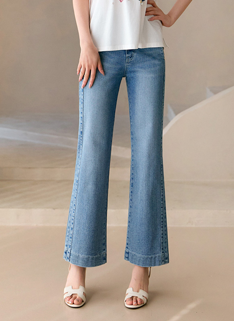 [Featuring strategic side seams that create a slimming effect while maintaining a semi-wide silhouette. Versatile medium blue wash for year-round styling.]