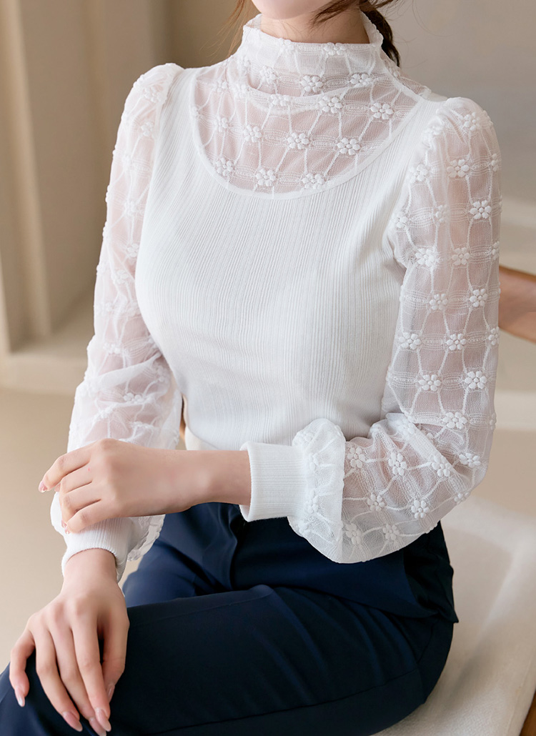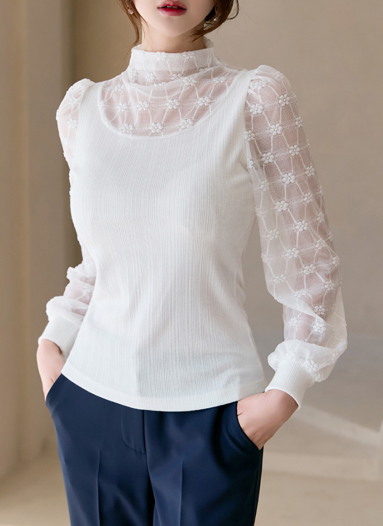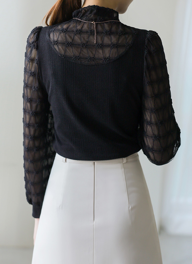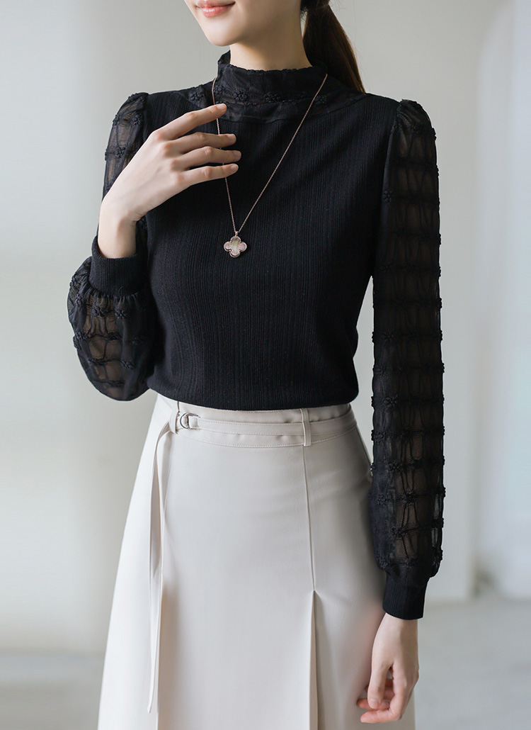 [Delicate ribbed blouse with sheer floral lattice sleeves and high neckline. Elegant puff sleeves create a feminine silhouette perfect for special occasions or elevated daily wear.]