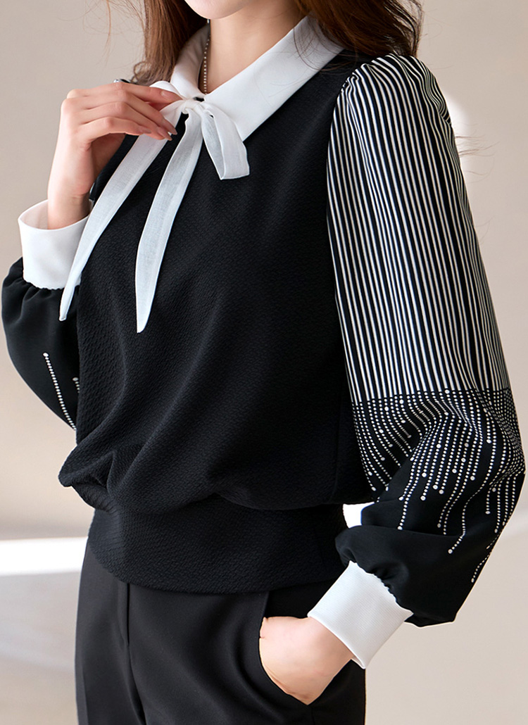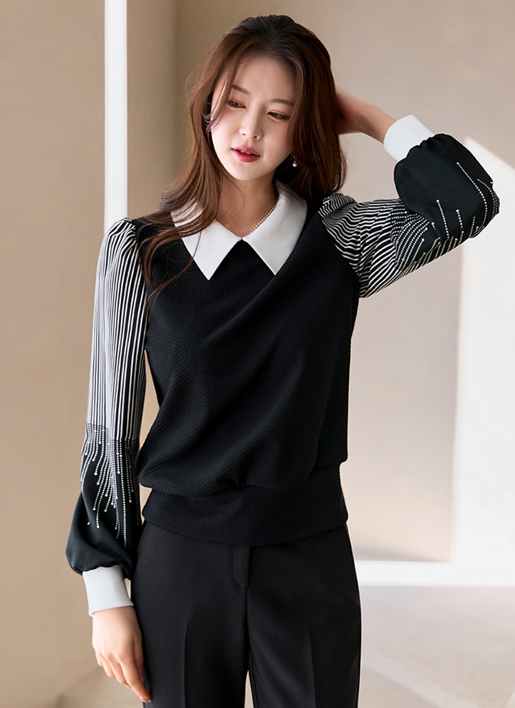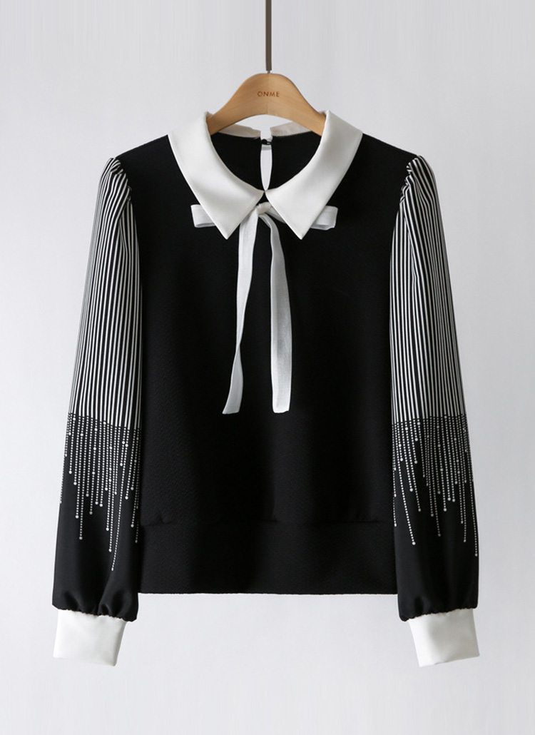 [Sophisticated black top with dramatic striped sleeve pattern resembling falling stars. Crisp white collar and cuffs add timeless elegance to this versatile statement piece.]