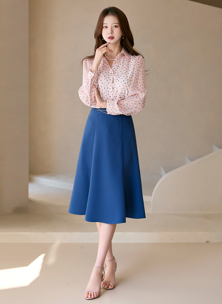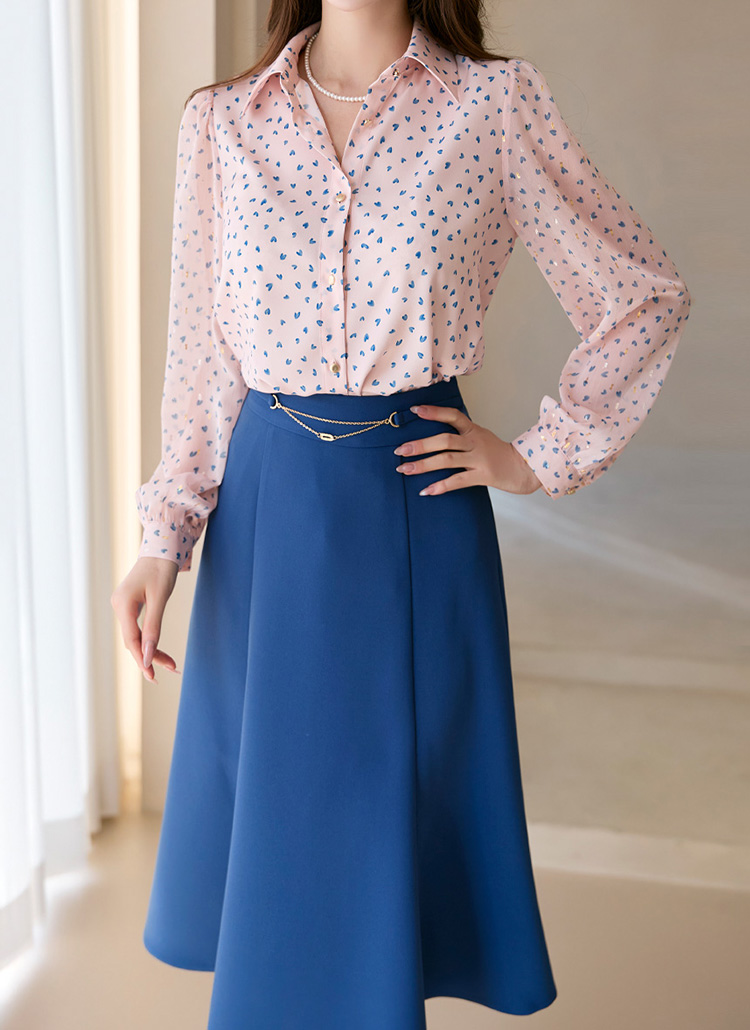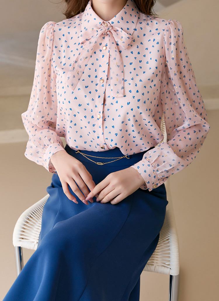 [Delicate pink blouse adorned with blue mini hearts and metallic dots, featuring ethereal chiffon sleeves that dance with every movement.]