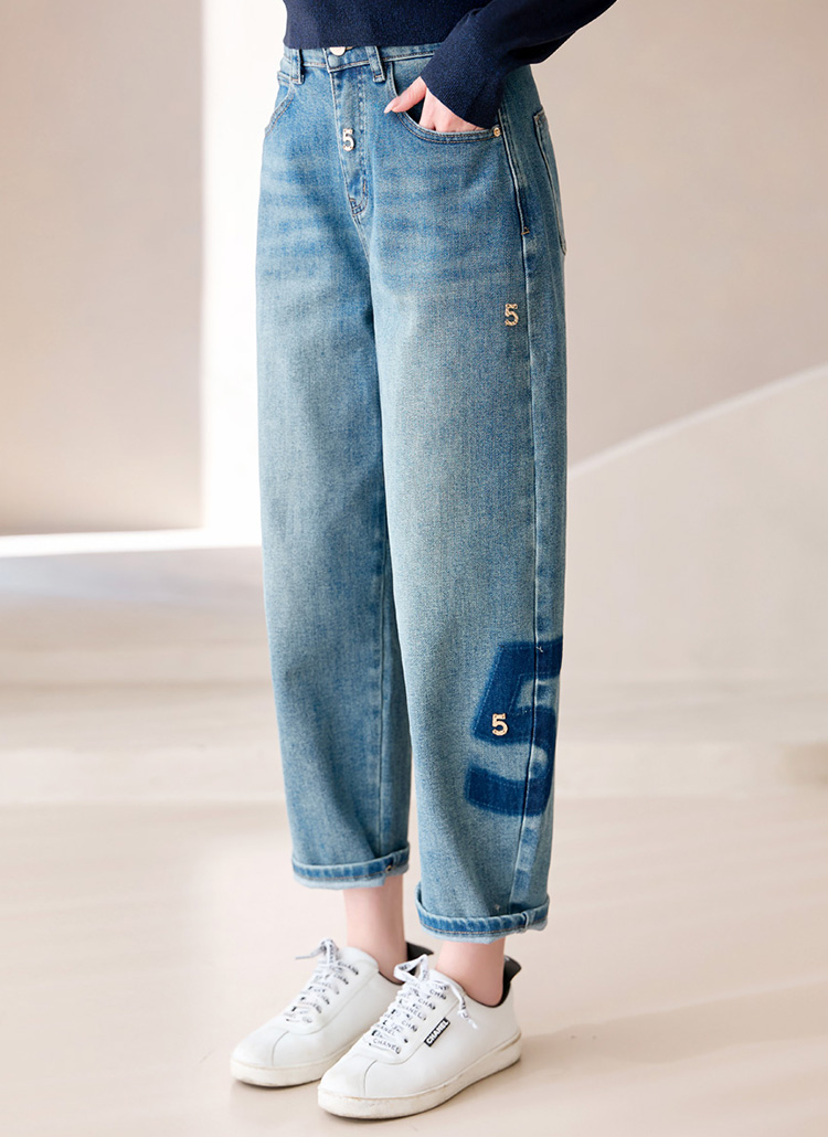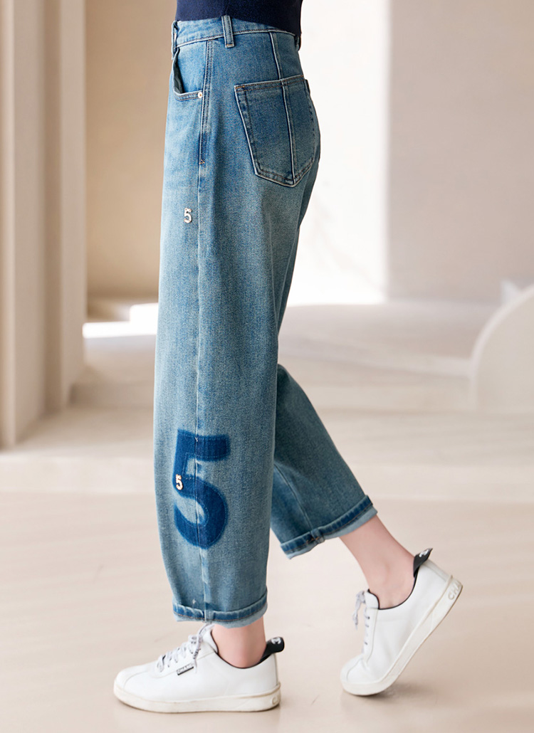 [Designed for effortless style, these denim pants feature a statement number "5" wash, gold pendant accents, and a comfy stretch fit.]