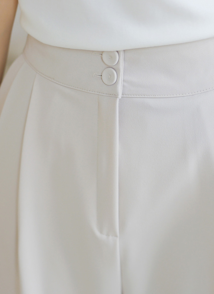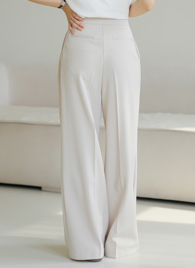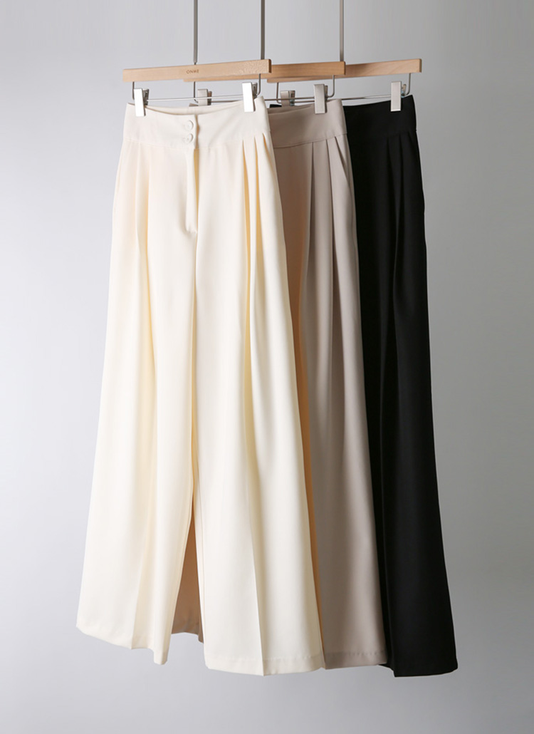 [Featuring a structured wide-leg fit, double-button waist, and elegant pintuck details, these slacks blend polish with ease.]