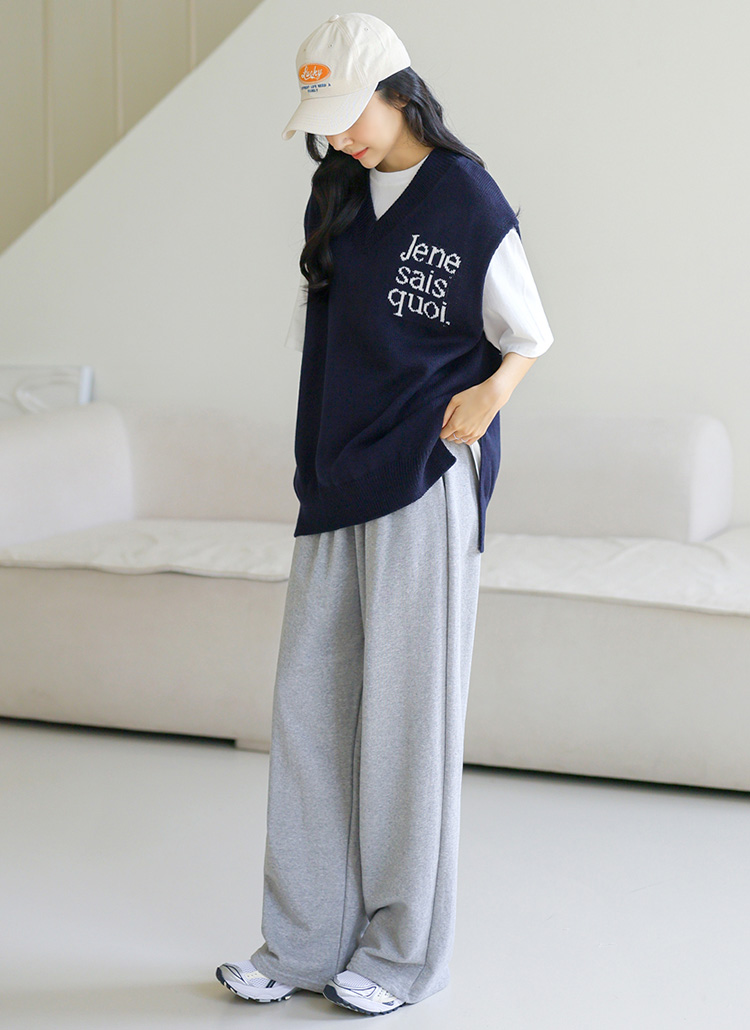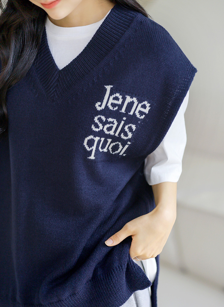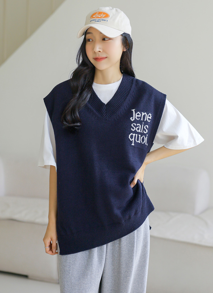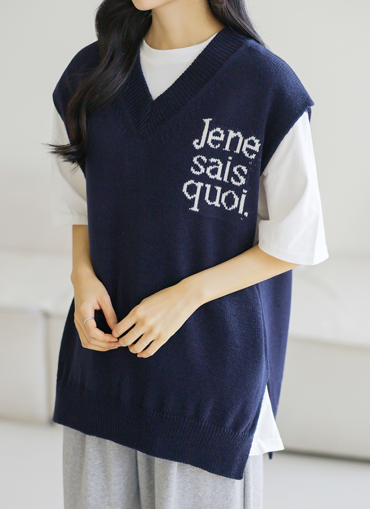 [A relaxed-fit V-neck vest with side slits and bold lettering for a casual yet effortlessly stylish layer.]