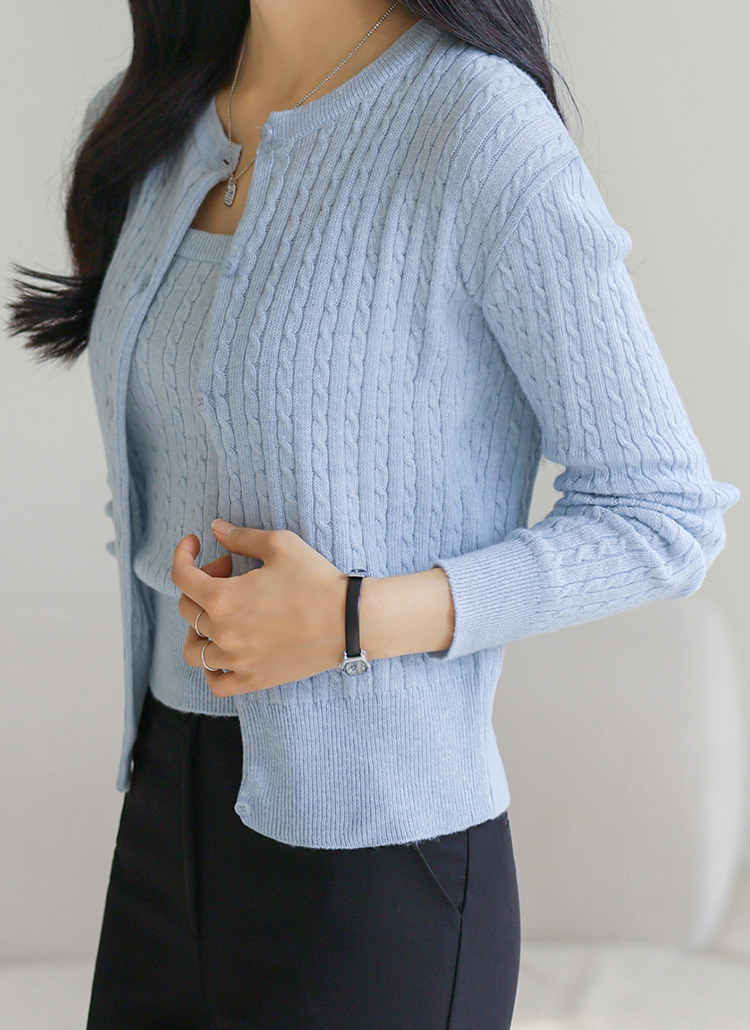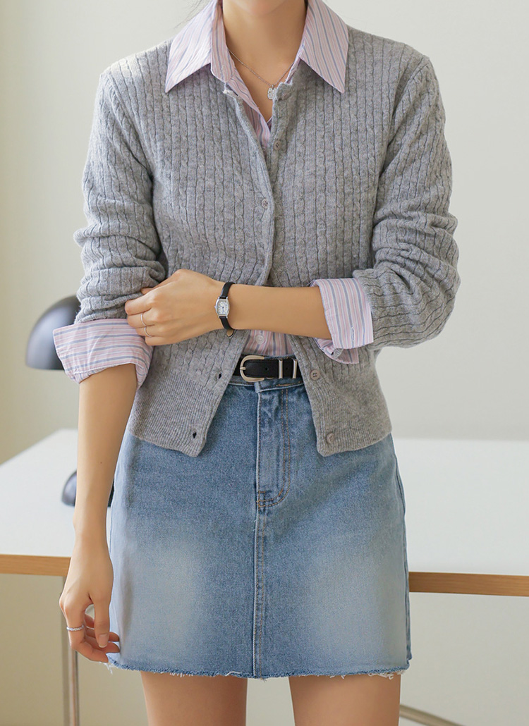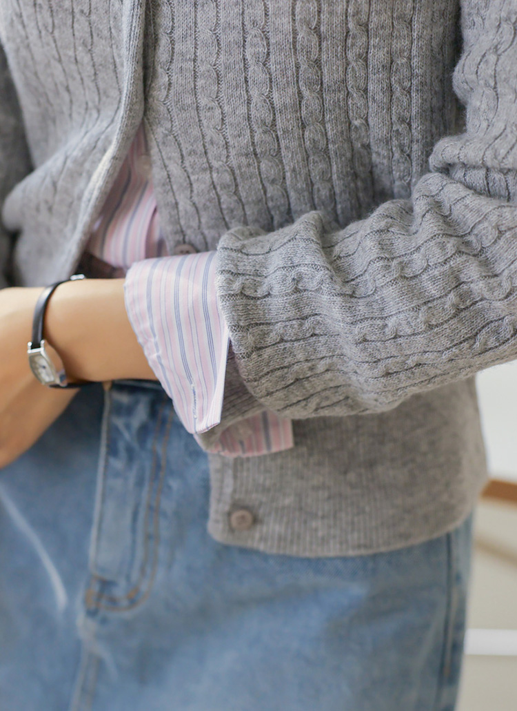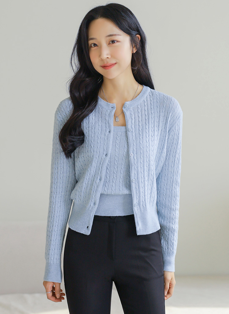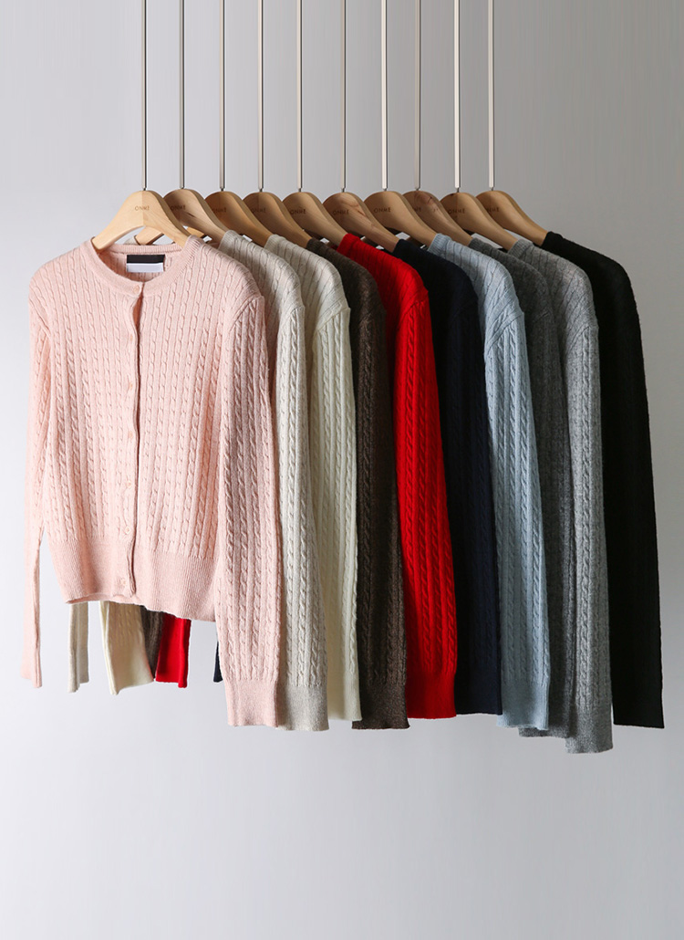 [ A timeless round-neck cardigan with a refined cable knit texture, available in 10 versatile colors.]