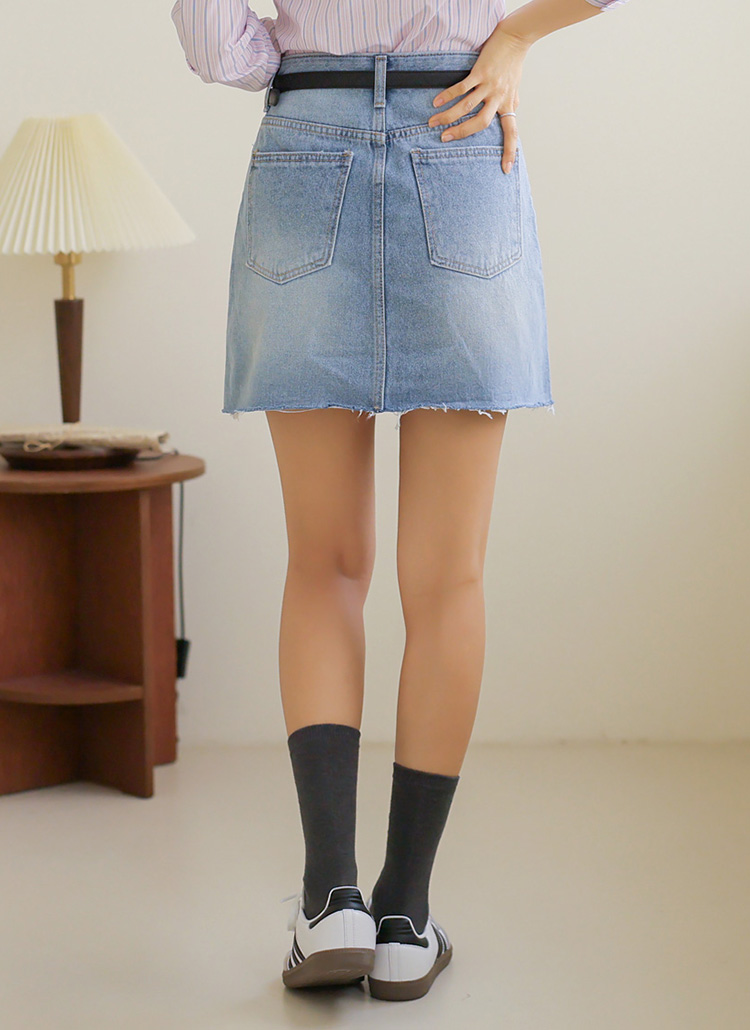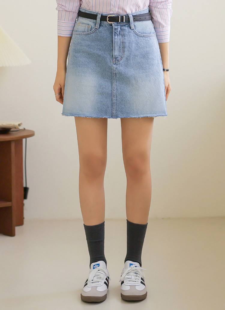 [Designed with a natural cut-off hem and classic 5-pocket detail, this A-line mini adds a touch of cool to any look.]
